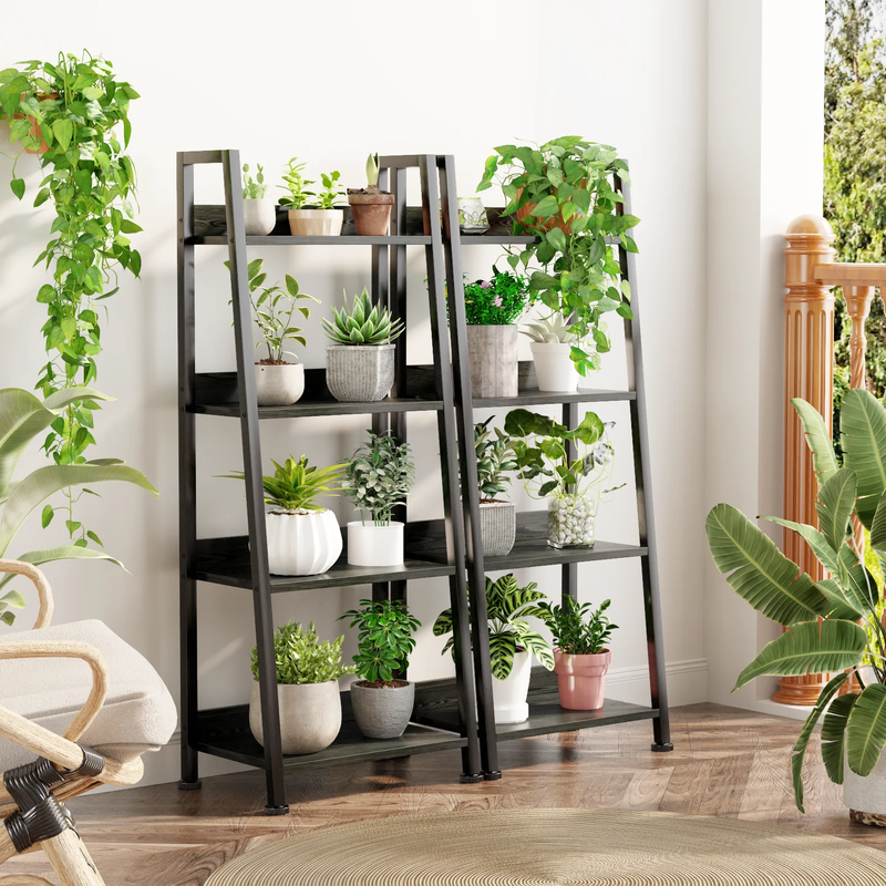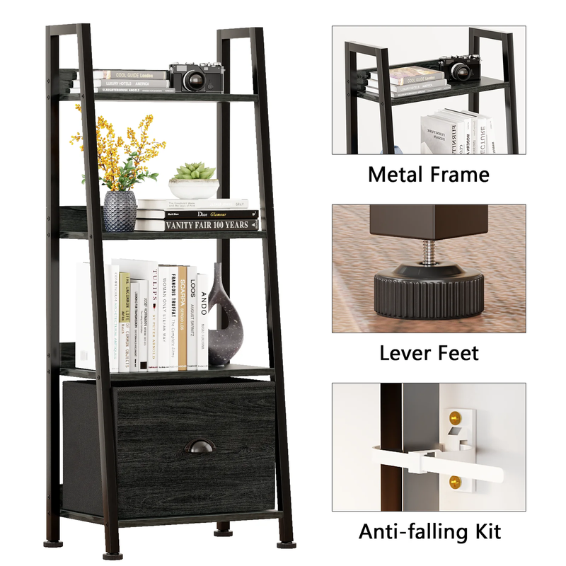 Detachable Fabric Drawer - This bookshelf includes a removable fabric drawer, offering versatile storage options. You can use it with or without the drawer, maintaining functionality either way. Sturdy Stable Construction - This bookshelf, crafted from high-quality particle board and a durable metal frame, features four adjustable feet and an anti-tip kit for enhanced durability and stability. Each shelf can support up to 50 lbs. Versatile Ladder Shelf - Perfect as a plant stand, bookshelf, or storage organizer in various spaces, this shelf provides a stylish display for your decor. It can also be used as a living room stand, kitchen storage rack, or display shelf. Modern Style - With its vintage minimalist design, this bookshelf seamlessly fits into living rooms, kitchens, bedrooms, balconies, bathrooms, and entryways. Suitable for adults, and the elderly alike. Easy Assembly - The 4-tier ladder bookshelf can be assembled in just 18 minutes using the included instructions and tools. With 24/7 quality customer service, you won't have to worry about lost or damaged parts. The overall dimensions of the bookshelf are 16.6" L x 11.5" W x 43.4" H.