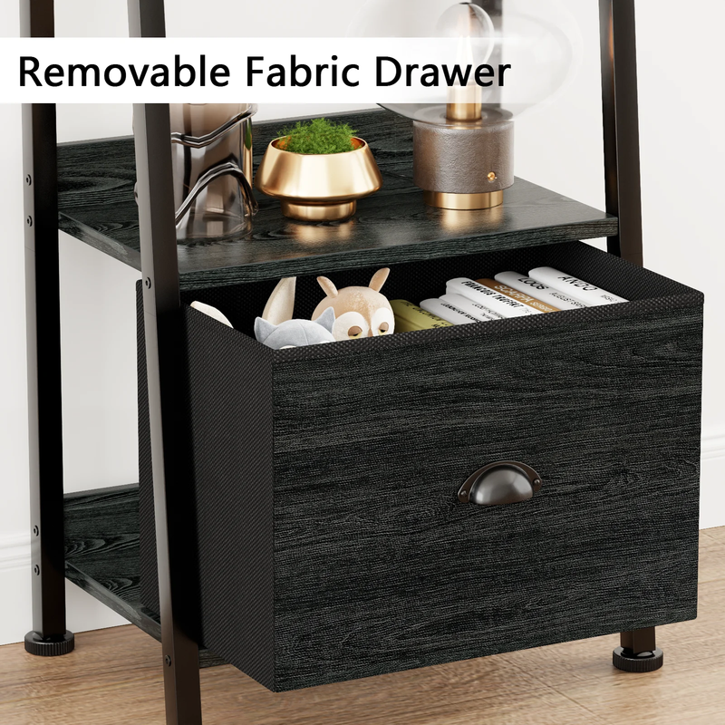 This versatile ladder bookshelf features a detachable fabric drawer for flexible storage. Crafted from high-quality particle board and a durable metal frame, it includes adjustable feet and an anti-tip kit for stability and safety. Each shelf supports up to 50 lbs, making it perfect for use as a plant stand, bookshelf, or storage organizer in various spaces. Its vintage minimalist design fits seamlessly into living rooms, kitchens, bedrooms, and more. Suitable for adults, and the elderly, it's easy to assemble in just 18 minutes with included instructions and tools. Enjoy 24/7 quality customer service for any issues.