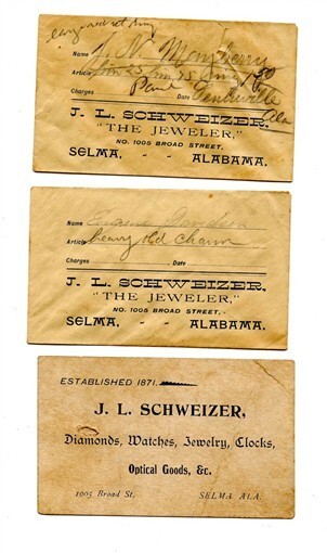 There are 3 items in this lot from J L Schweizer, The Jeweler in Selma Alabama . A Business Card with writing on the back and 2 used Envelopes . From 1901