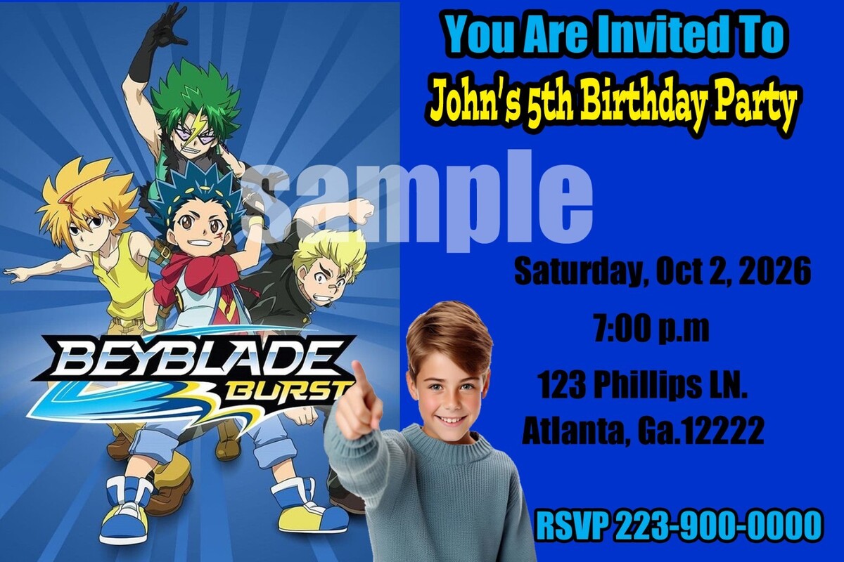 BEYBLADE BURST Birthday party Invitations w/ 12 envelopes customized your photo