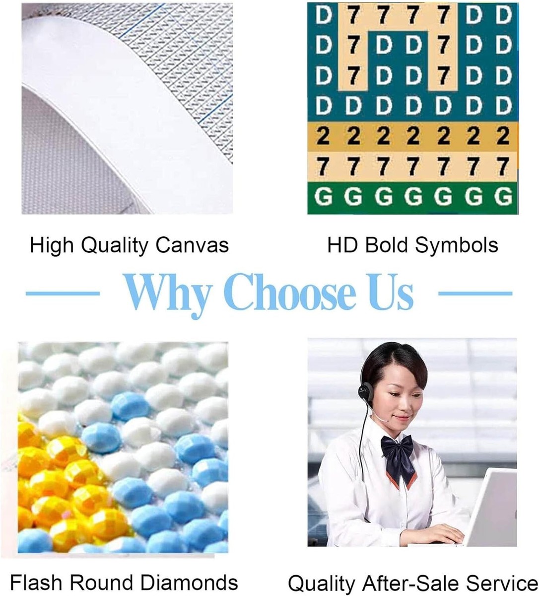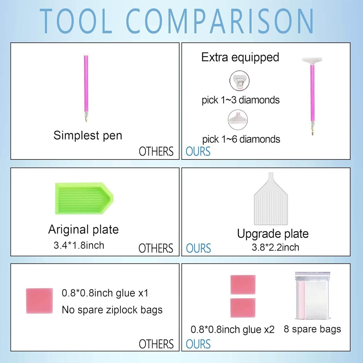 Includes 1*HD print canvas, 1*pen, 1* 3-drill pen tip, 1* 6-drill pen tip, 4*glue, 1*plate, 10*spare ziplock bags, and sufficient round diamonds.