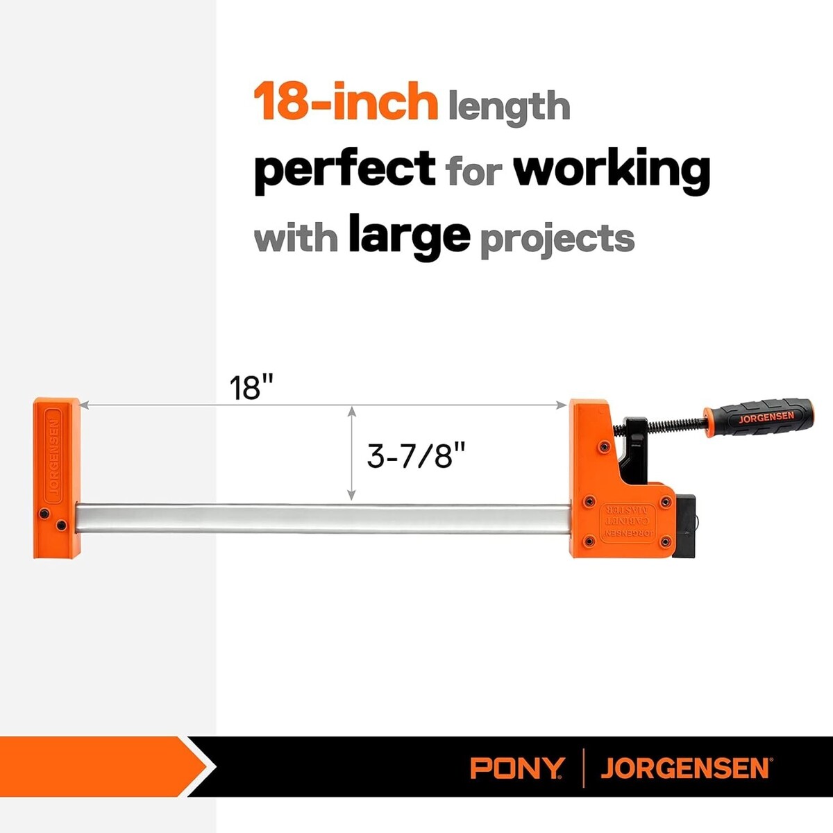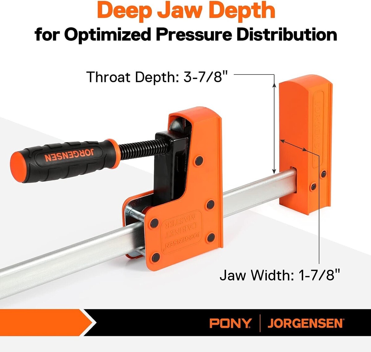 18? Bar Clamp: The throat depth of this parallel clamp is 3-7/8 inch, jaw width is 1-7/8 inch, ensuring a wide enough surface to clamp your workpieces tight and keep them square and free from movement.