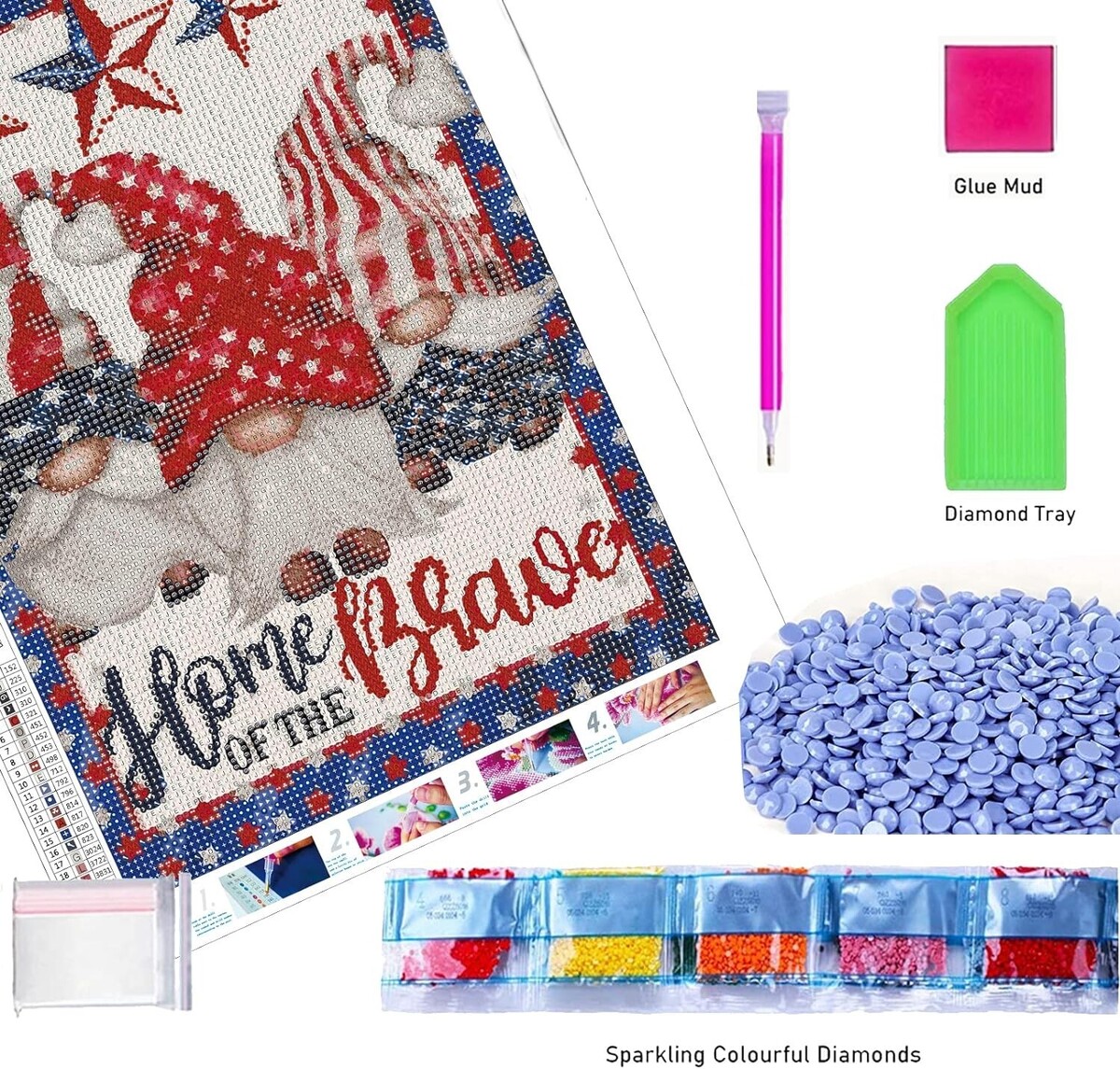 Contains waterproof painting canvas, diamond sticky pen, diamond plate, glue, and enough round drill