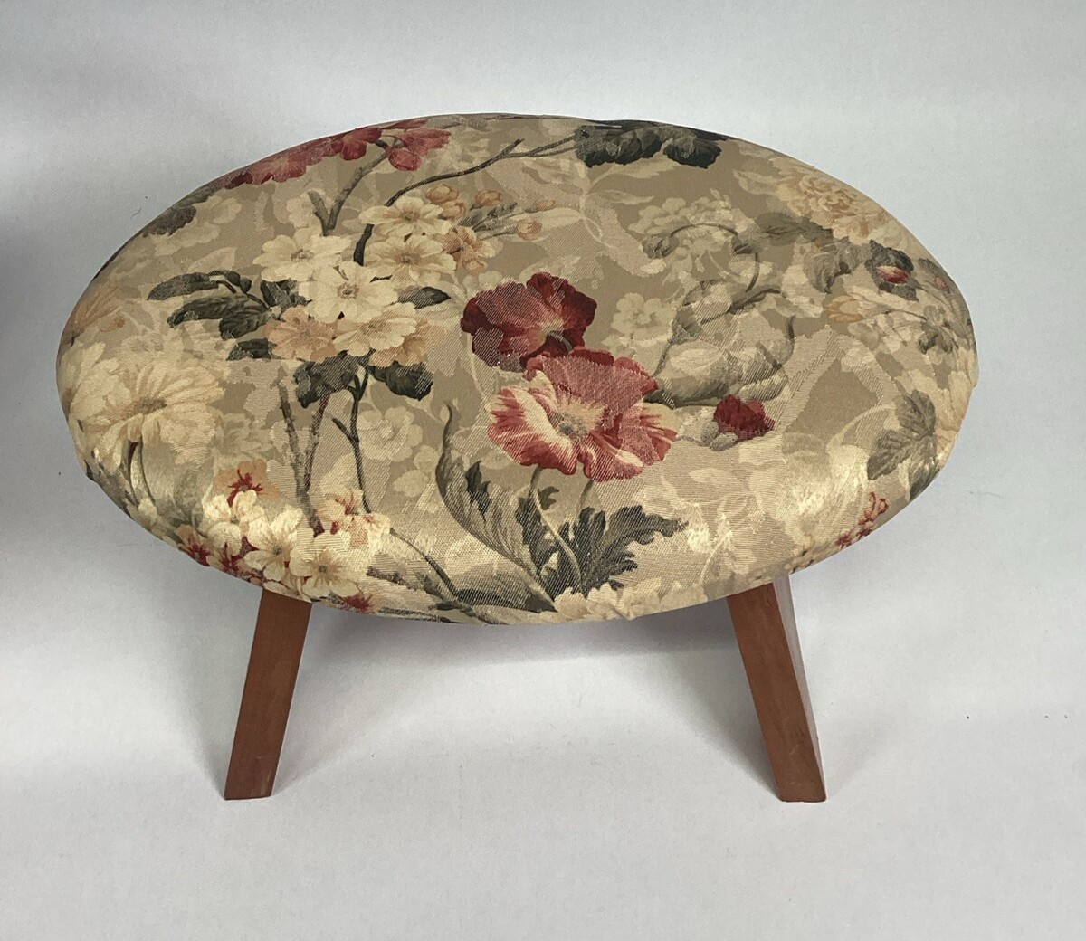 Vintage Floral Footstool Ottoman With Wooden Legs - 14x10.5x9?. The floral part is made of material and is plush. It?s handmade. The wooden legs are slightly off balance. One leg doesn?t fully touch the ground. Please ask any questions before
