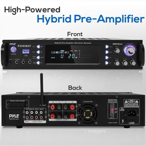 Experience powerful and versatile home audio with the Pyle P3301BAT 3000W Bluetooth 5.0 Home Stereo Amplifier, a hybrid multi-channel receiver designed to elevate your sound system. Delivering up to 3000 watts of peak power, this rack-mountable amplifier is perfect for home theaters, karaoke setups, and audio systems that demand clarity and volume. With built-in Bluetooth 5.0, enjoy seamless wireless streaming from smartphones, tablets, and computers. Equipped with AM/FM radio, dual mic inputs, USB/SD card readers, AUX, and multiple RCA inputs, this unit supports a wide range of audio sources. Front panel controls, a digital display, and an included remote make it easy to operate, while the speaker selector function allows control over multiple zones for a customized listening experience.