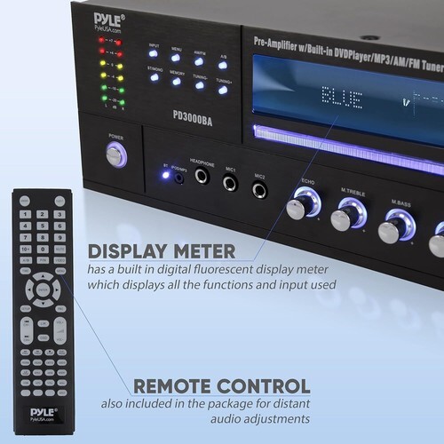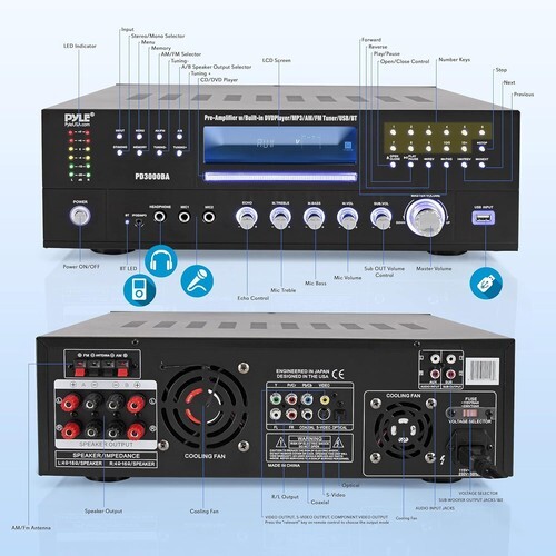 The Pyle Home Theater Receiver provides versatile audio and video entertainment. High-Powered stereo preamplifier performance comes loaded with audio playback features including front-loading CD/DVD player, AM/FM radio, USB SD flash memory readers, aux (3.5mm) input and two 1/4'' -inch microphone inputs. Connect external surround sound speakers to create a cinema-style media experience in your living room. Bluetooth wireless receiver ability is compatible with all of today?s latest devices and features hassle-free setup for instant music streaming. Get connected to your entire home theater system including the TV, DVD player, soundbar, subwoofers and multi-channel speakers for full-ranged pro audio stereo sound enjoyment. Rear panel connector types include speaker terminal binding posts, RCA audio inputs, dedicated subwoofer output, digital optical audio output, component S-video connector -- along with a headphone jack for private listening. MP3 digital audio file support allows you to playback your entire digital media file library while you configure your sound via the front panel button control center. Enjoy versatile audio entertainment ability with the Pyle Bluetooth Home Theater Stereo Receiver System.