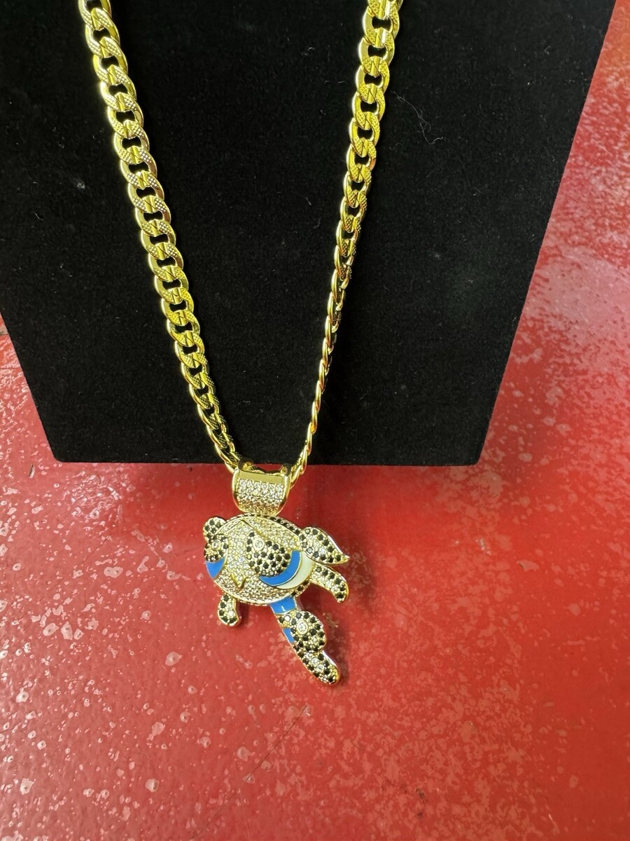 Gold plated chain 24in with power poff pendant doesn?t turn color new