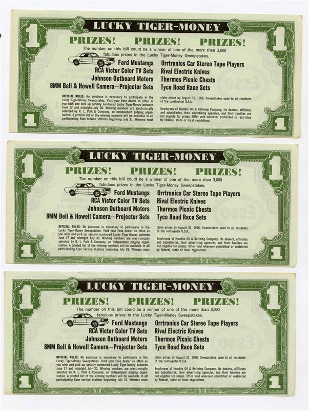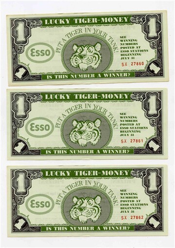 A Lot of 3 ESSO Lucky Tiger Money Dollar Bills. Has Put A Tiger in Your Tank and IS This Number a Winner on the front and Sweepstakes Prizes and Rules on the back. This lot of 3 ESSO Lucky Tiger Money has Consecutive Numbers. Dated 1965