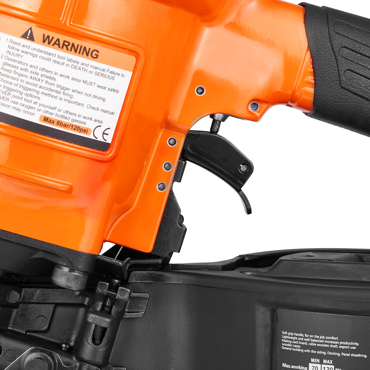 Outstanding Performance: VEVOR MCN70 pneumatic coil nailer is compatible with wire-collated coil nails, accommodating lengths from 1-3/4 to 2-3/4 inches and head diameters from ?5.5 to ?7 mm. It is perfect for assembling pallets, wooden boxes, fencing, crating, and general construction tasks like siding, decking, and sheathing. (Compatible Shank Diameter: Min 2.3 mm - Max 2.9 mm)