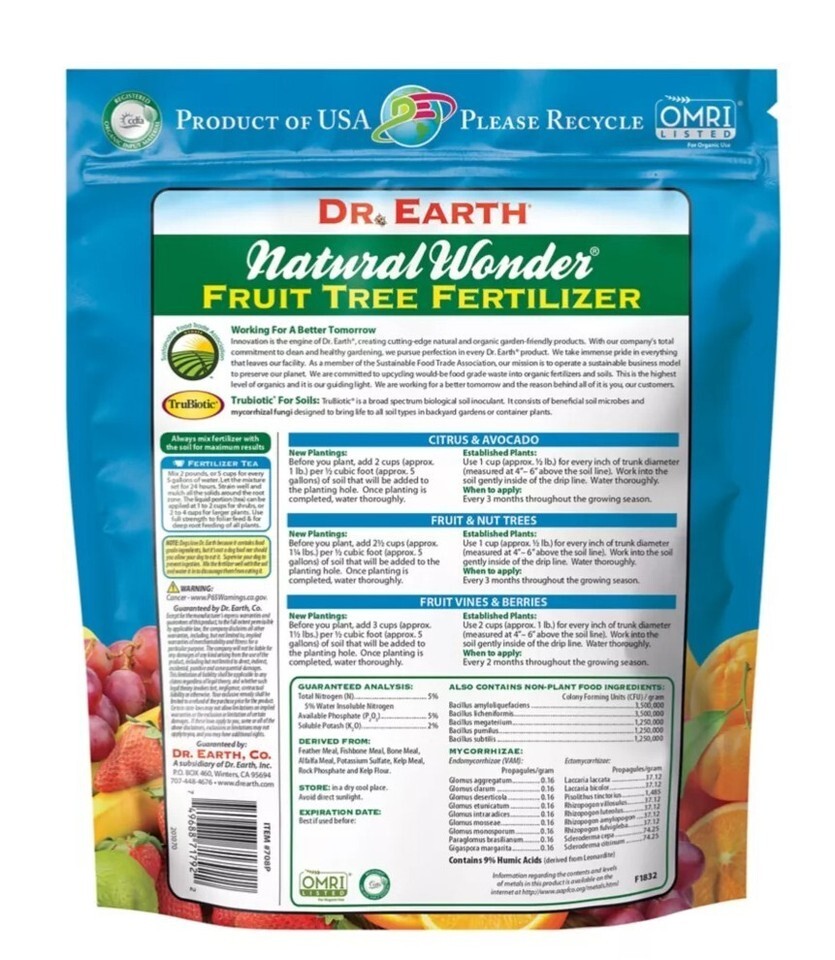 Dr. Earth Natural Wonder Fruit Tree Fertilizer (4 lb.) is specially designed to nourish all types of fruit trees, berries, and fruiting vines, whether in containers or in backyard soil. This fertilizer can be applied at the time of initial transplanting or anytime throughout the year to support actively growing fruit trees and vines. It contains no synthetic ingredients or GMO-laden chicken manure.