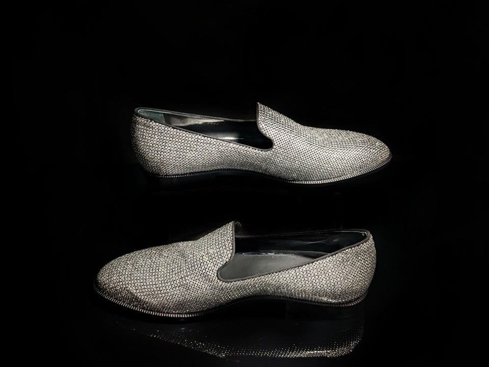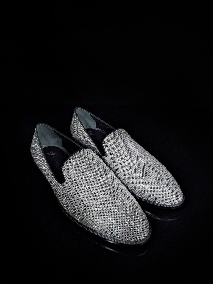 Elevate your style with these stunning Giuseppe Zanotti Crystal Jareth Disco Men's Shoes in size 13, new in box. These slip-on loafers feature a solid pattern in a shimmering silver color, perfect for any casual occasion. The upper and outsole are made of high-quality leather, ensuring durability and comfort. Made in Italy, the attention to detail and craftsmanship is evident in every aspect of these shoes, from the sleek design to the intricate crystal detailing. Add a touch of glamour to your wardrobe with these exquisite shoes from a renowned brand.