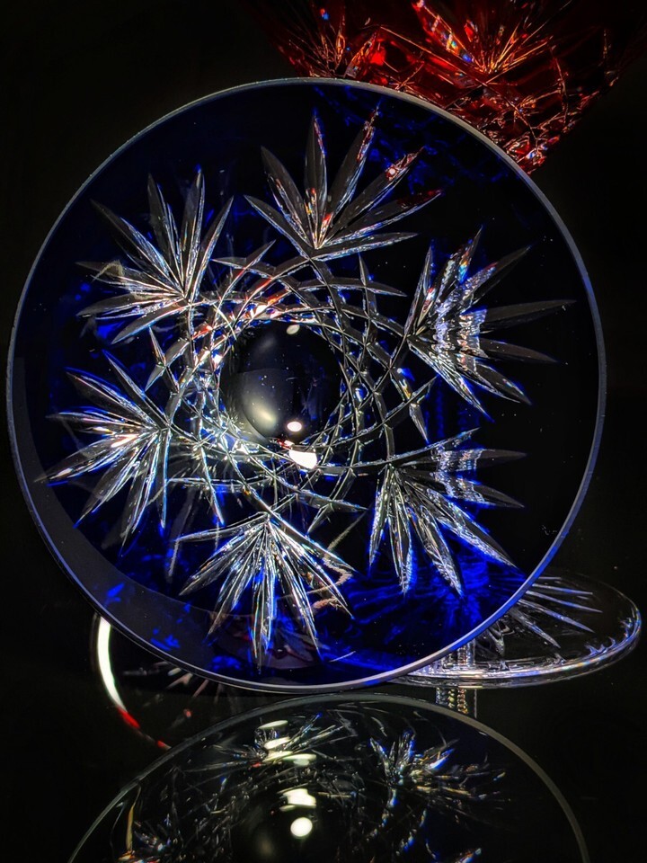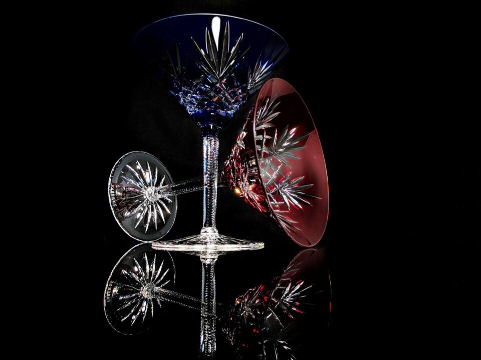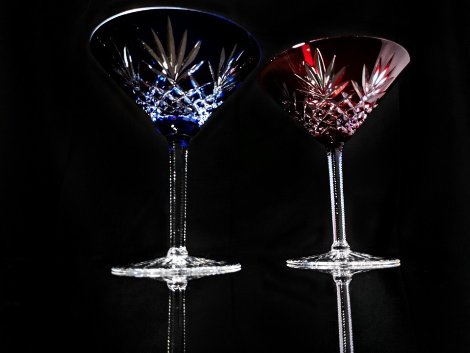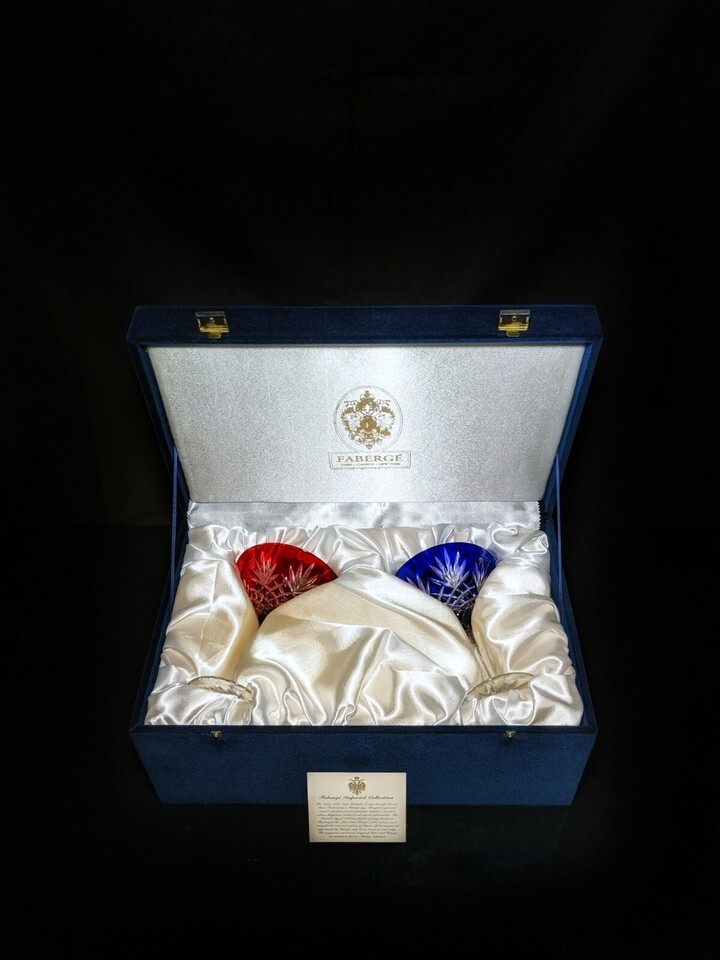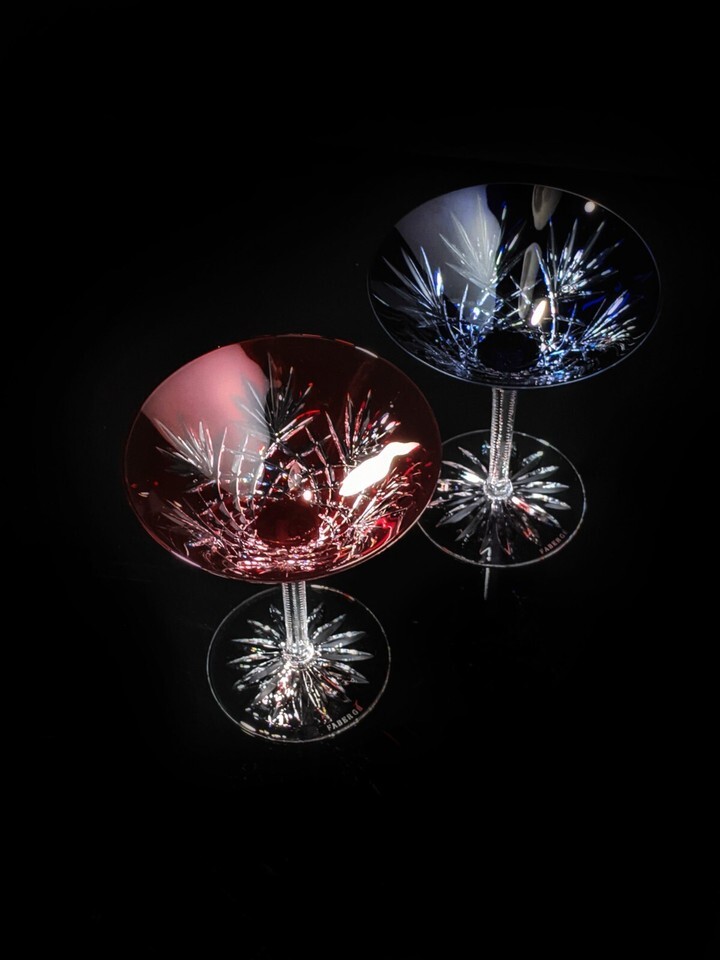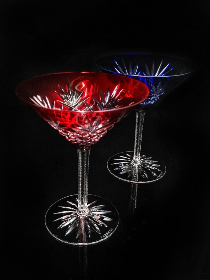 Faberge Crystal Martini Glasses One Red & One Blue in presentation case