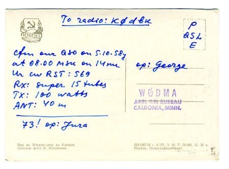 Sent through the QSL Bureau. 1958 QSL Leningrad UA1KAG USSR