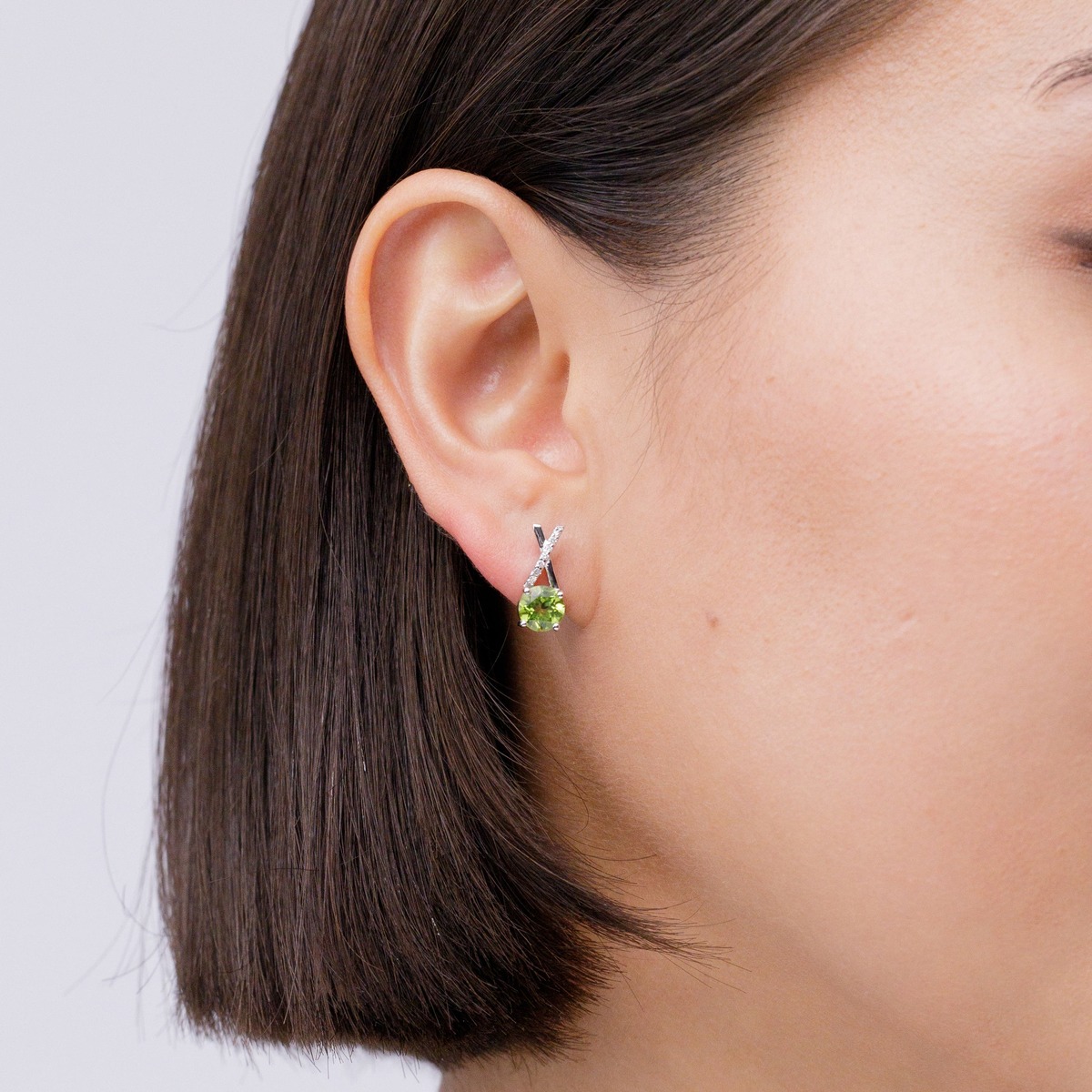A diamond-studded bar intersects a lustrous metal bar to form an ornate X on these subtle earthy green peridot solitaire earrings. The round peridots are prong set below the X motifs to complete the XO design. Crafted in silver, this alluring pair of peridot and diamond earrings captivates with its stylish and contemporary design.