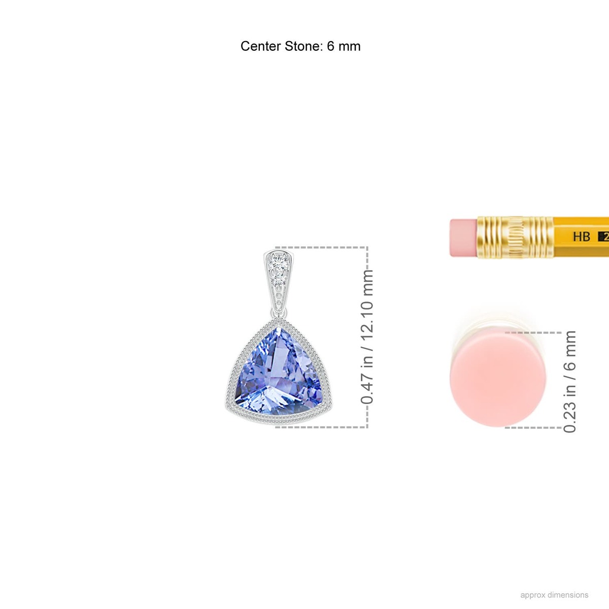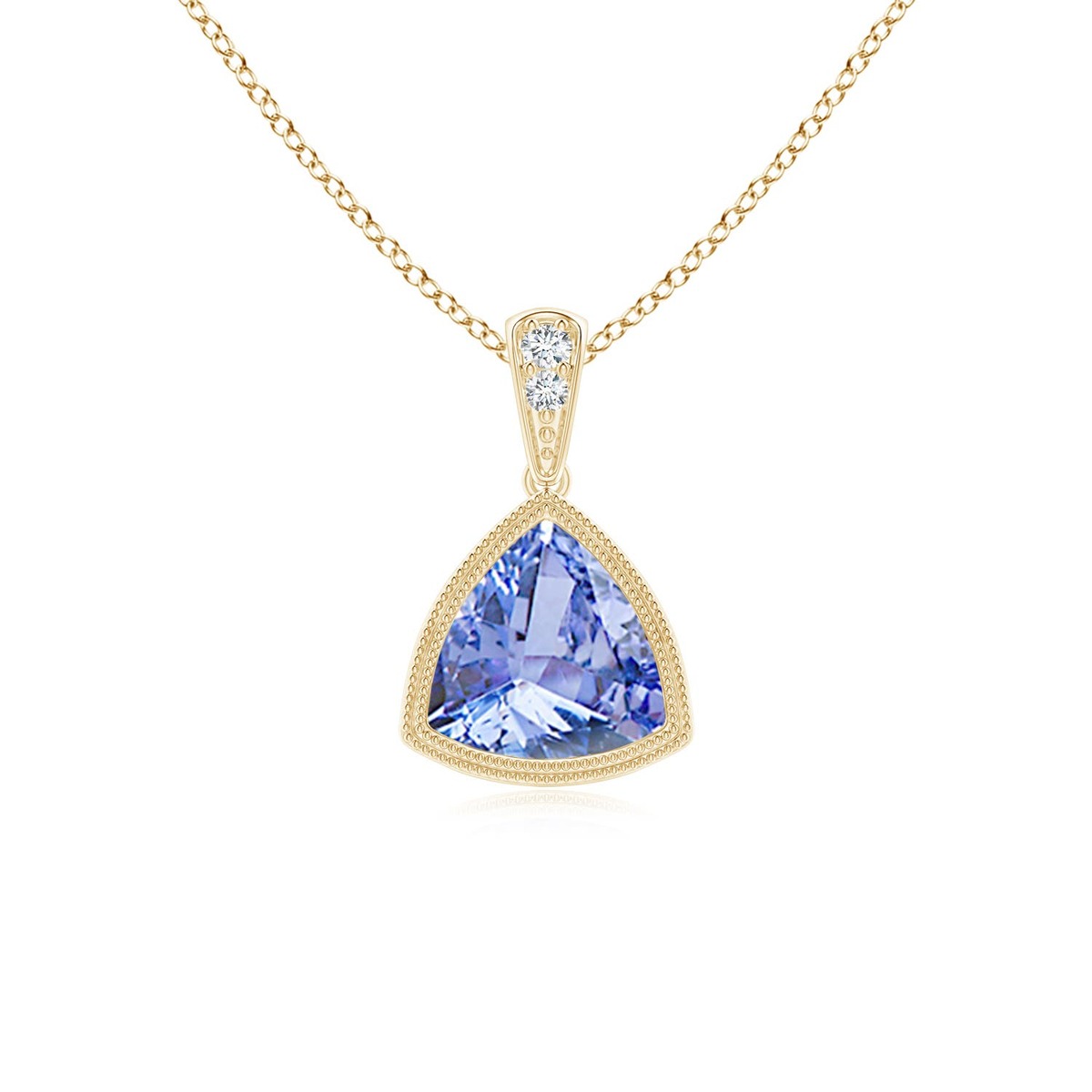 Dangling from a diamond bale, this 14k solid gold trillion tanzanite pendant is a covetable piece. It features fine milgrain detailing around the gemstone. The bluish violet trillion tanzanite is secured in a bezel setting.