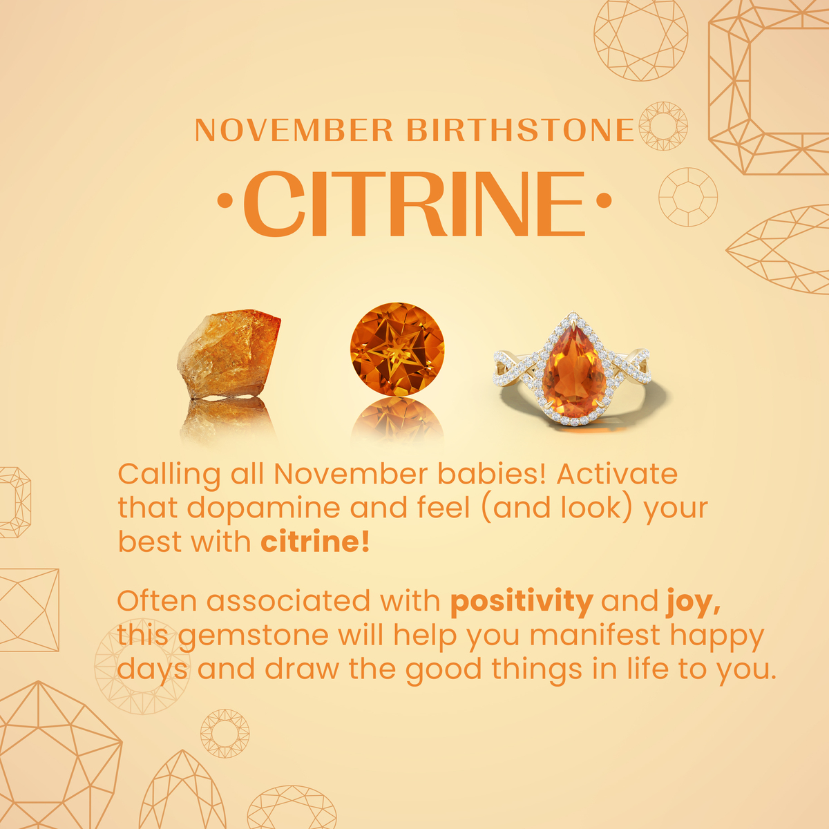 Celebrated for its warm yellow-golden hue, citrine radiates positivity and joy. Symbolizing success, prosperity and optimism, this vibrant gemstone will bring an uplifting energy into your life. Plus, it?s also the birthstone for November and the traditional gemstone for the 13th wedding anniversary.
