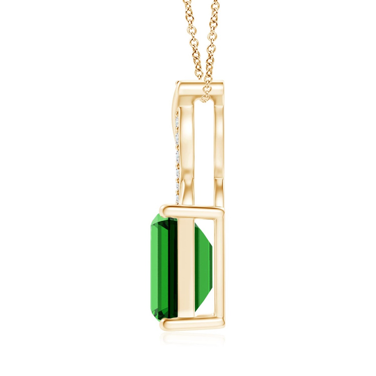 The emerald-cut lab-grown emerald in prong setting captivates the senses with its rich green hue. It is enhanced by the sparkling lab-grown diamond accents partially embellished on the entwined metal bale. This stunning lab-grown emerald infinity pendant is crafted in 14k solid gold.