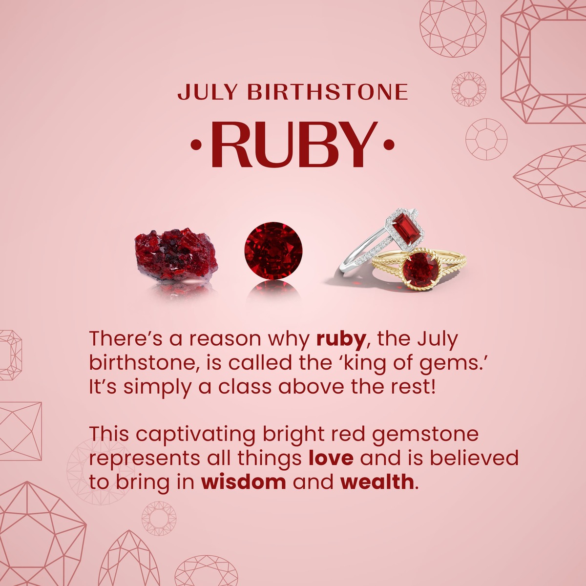 Ruby, the July birthstone and a classic gift for 15th 40th anniversaries, stuns with its rich red hue?a bold symbol of love, passion, and timeless elegance. Ruby is a favorite in fine jewelry pieces such as Ruby pendant, Ruby ring, and Ruby earrings.