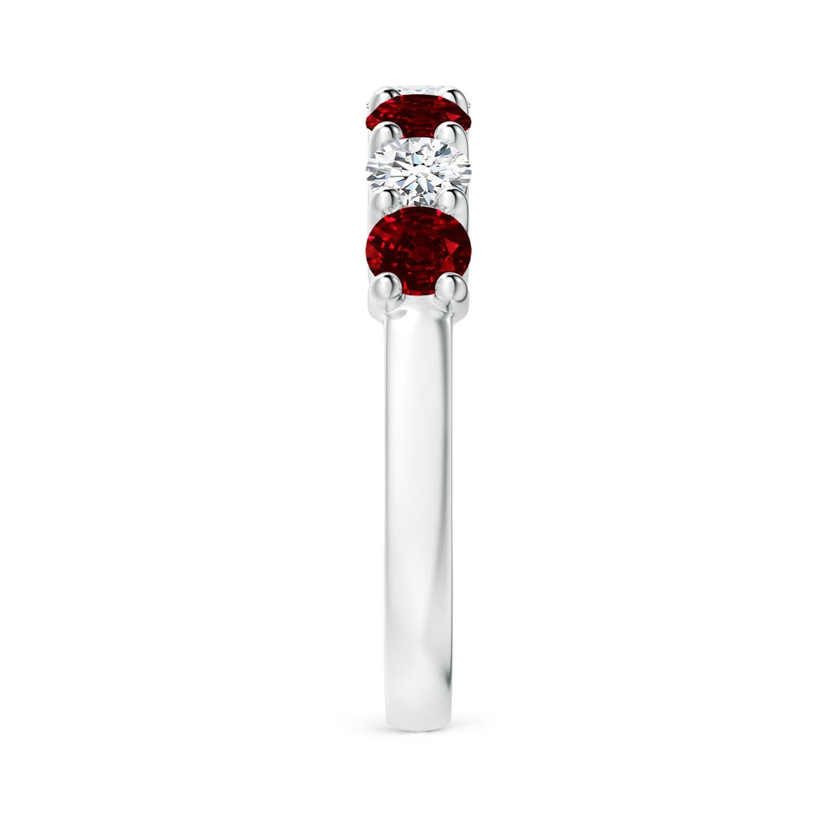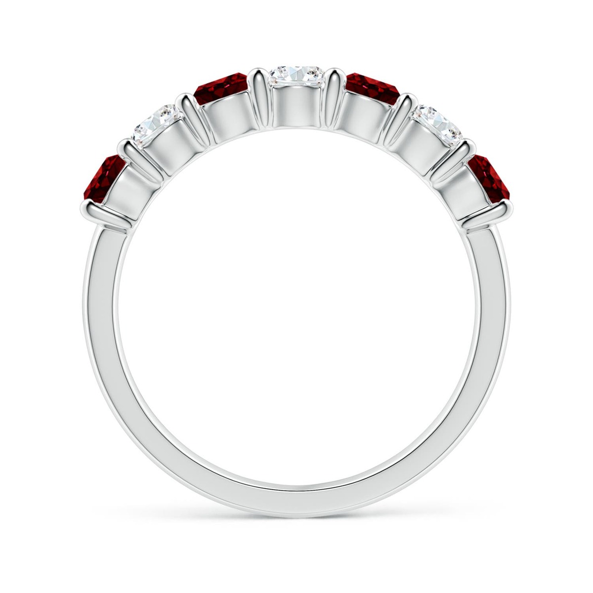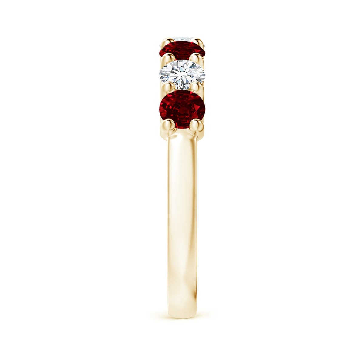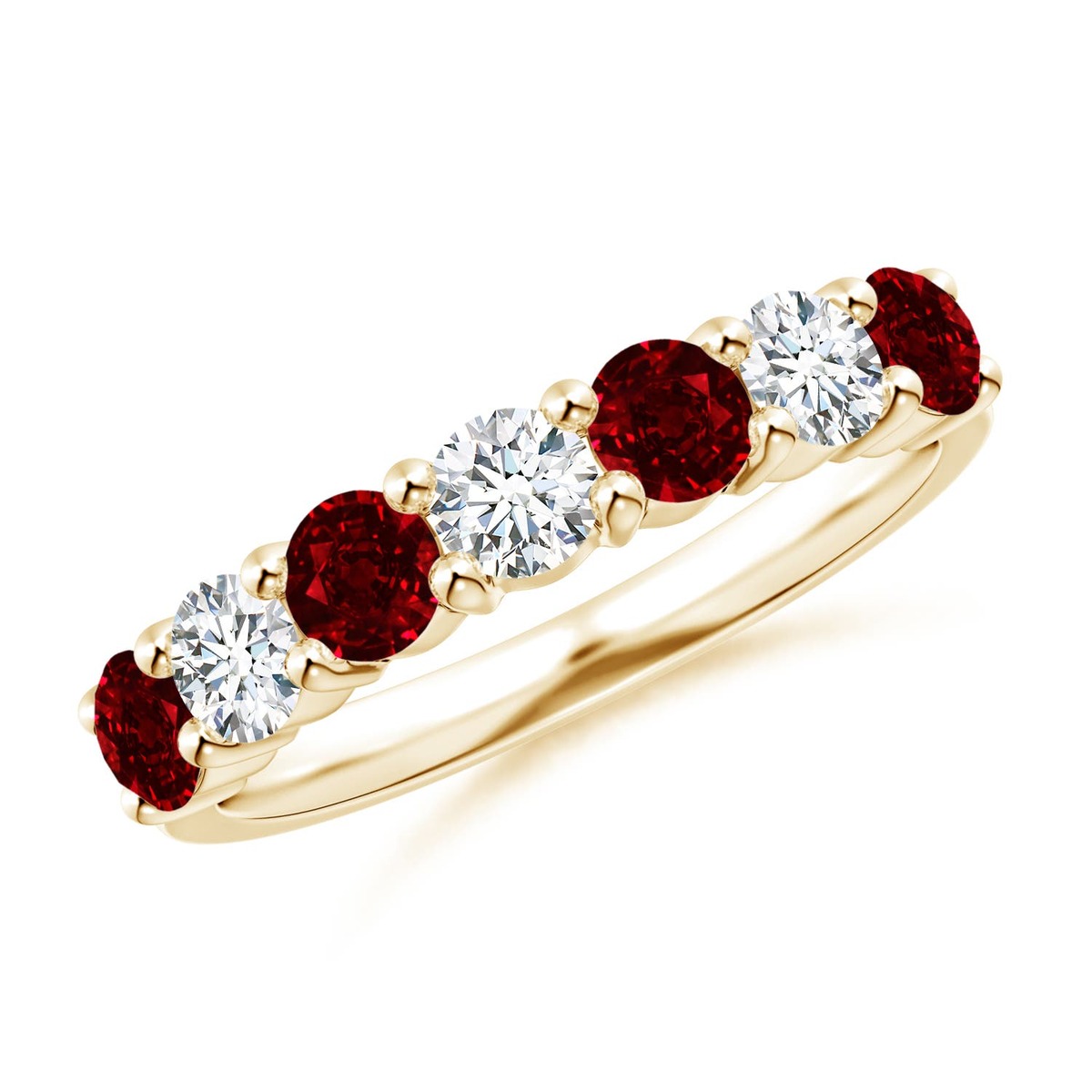 Say 'I do' in style with this 14k solid gold half eternity wedding ring. The round rubies and the round diamonds are alternately prong set for a mesmerizing look.This Ruby ring is crafted in Solid Gold ? a stunning choice for lovers of fine Ruby jewelry. Every item comes with an Angara Certificate of Authenticity, which will be sent to you via messages or with the package.