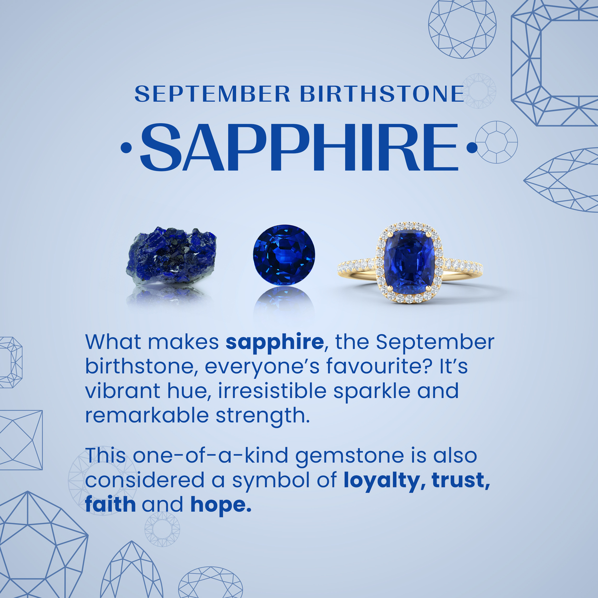 Lab-grown blue sapphire looks nothing less than gorgeous, thanks to its intense blue color and mesmerizing brilliance. Symbolizing love, loyalty, good luck and inner peace, it's a timeless yet affordable choice for marking special occasions. Plus, it's also the birthstone for September and the traditional gemstone for the 5th and 45th wedding anniversaries.
