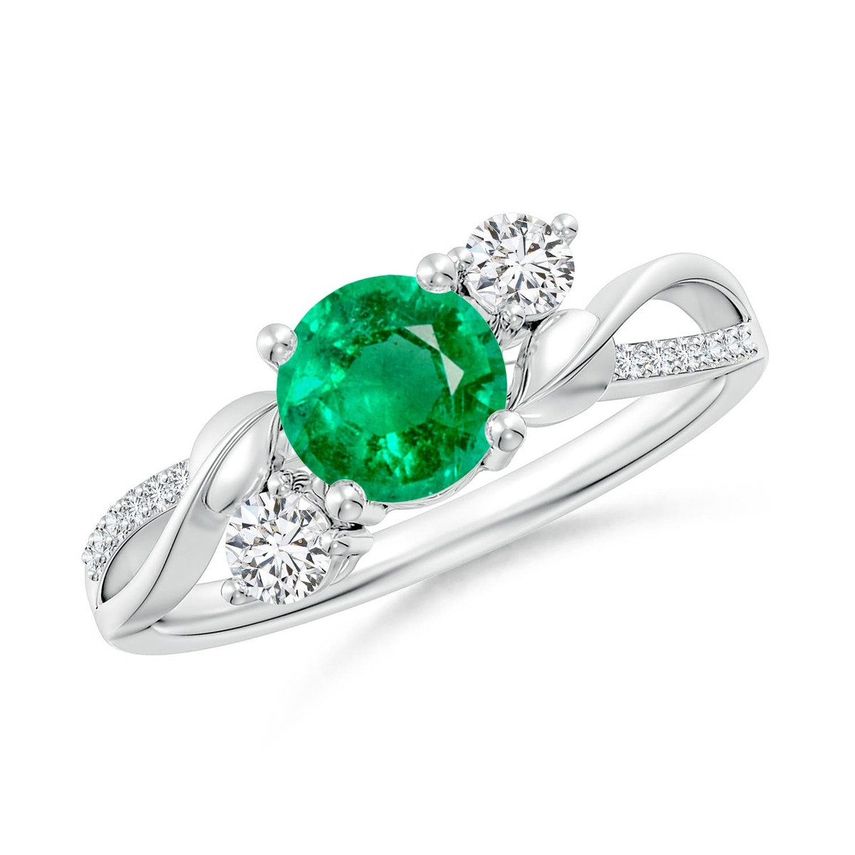 Symbolic of the past, present and future, this three stone engagement ring is a great way to celebrate your eternal bond. Flanked by brilliant diamonds, the prong-set round emerald captures attention with its lush green hue. The twisted shank, partially adorned with diamonds, and the leaf motifs on the gallery further elevate the charm of this 14k solid gold ring.