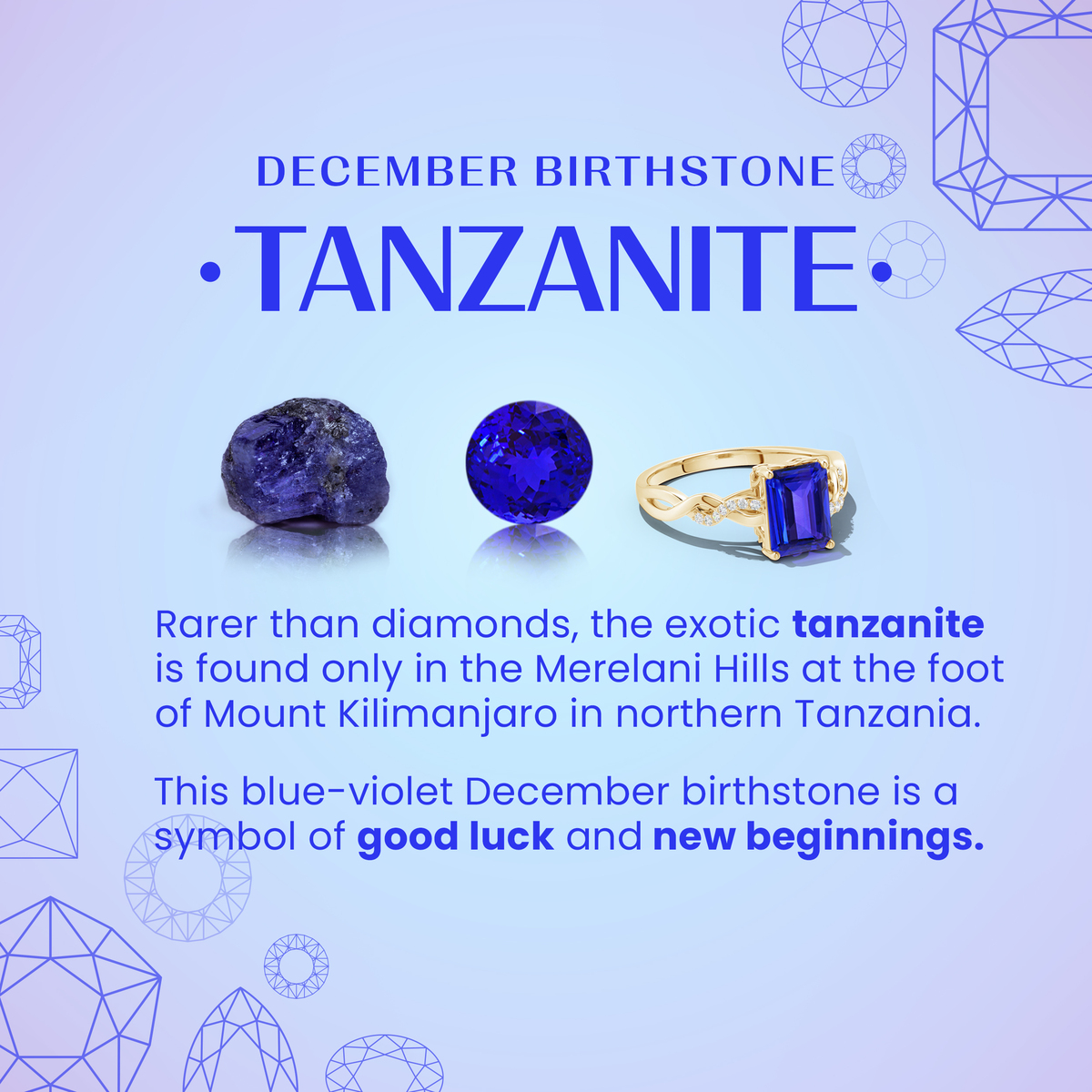 Known for its enchanting deep blue to violet hues, tanzanite is a total showstopper. This rare gem is also prized for its unique brilliance. It symbolizes abundance and new beginnings. What's more, it's also the birthstone for December and the traditional gemstone for the 24th wedding anniversary.