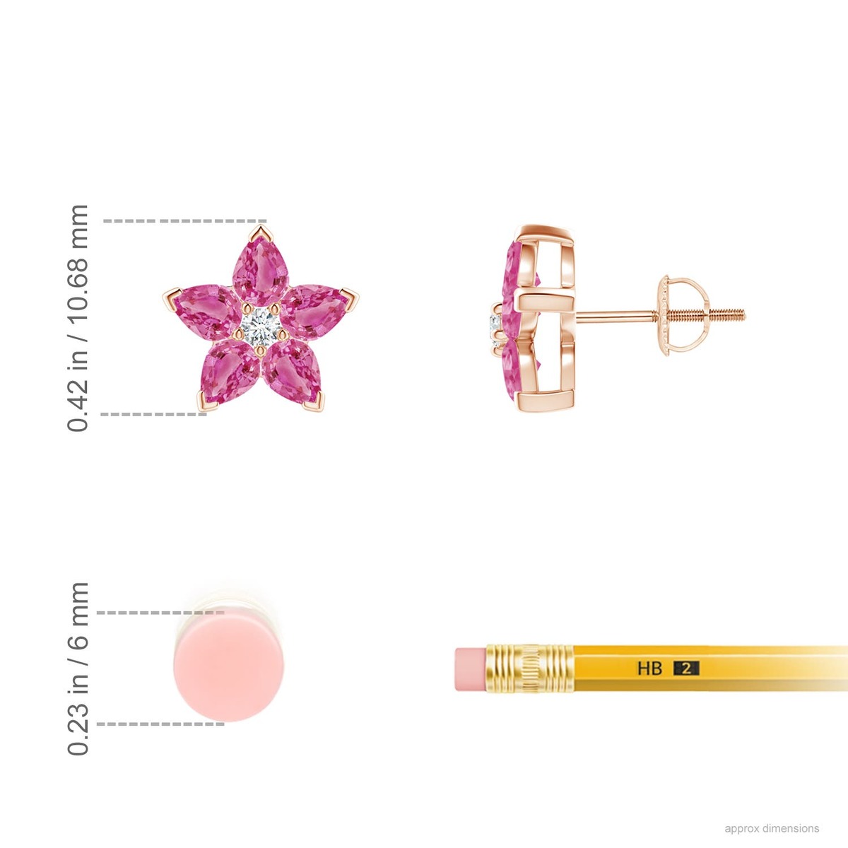 Pear-shaped pink sapphires surround a round diamond to complete the gorgeous floral design. The V-prong set pretty pink gems shine with breathtaking beauty, while the diamond adds to their irresistible charm. This stunning pair of pink sapphire stud earrings is crafted in 14k solid gold.