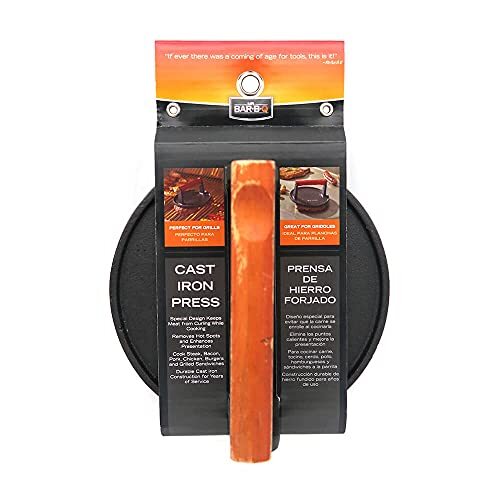 Bullet point: PRE-SEASONED CAST IRON PRESS ? The Mr. Bar-B-Q Cast Iron Grill Press arrives pre-seasoned and ready to use, eliminating the need for extra oiling or preparation. This burger smasher features a ridged bottom that enhances heat retention and contact, helping to cook food faster and more evenly. Whether you're grilling indoors or outdoors, it locks in flavor and leaves behind delicious sear marks.