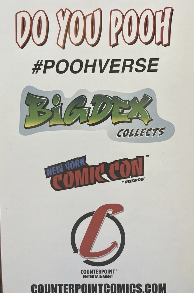 The product is a limited edition NYCC exclusive comic book titled "Do You Pooh?" with a honey pot cover, part of the BigDexCollects series. Written by Marat Mychaels and published by Counterpoint Entertainment, this variant edition features the beloved character Pooh in a unique color style. This modern age US comic book is graded near mint/mint and includes a variant cover, making it a sought-after collectible for fans of superheroes and US comics.