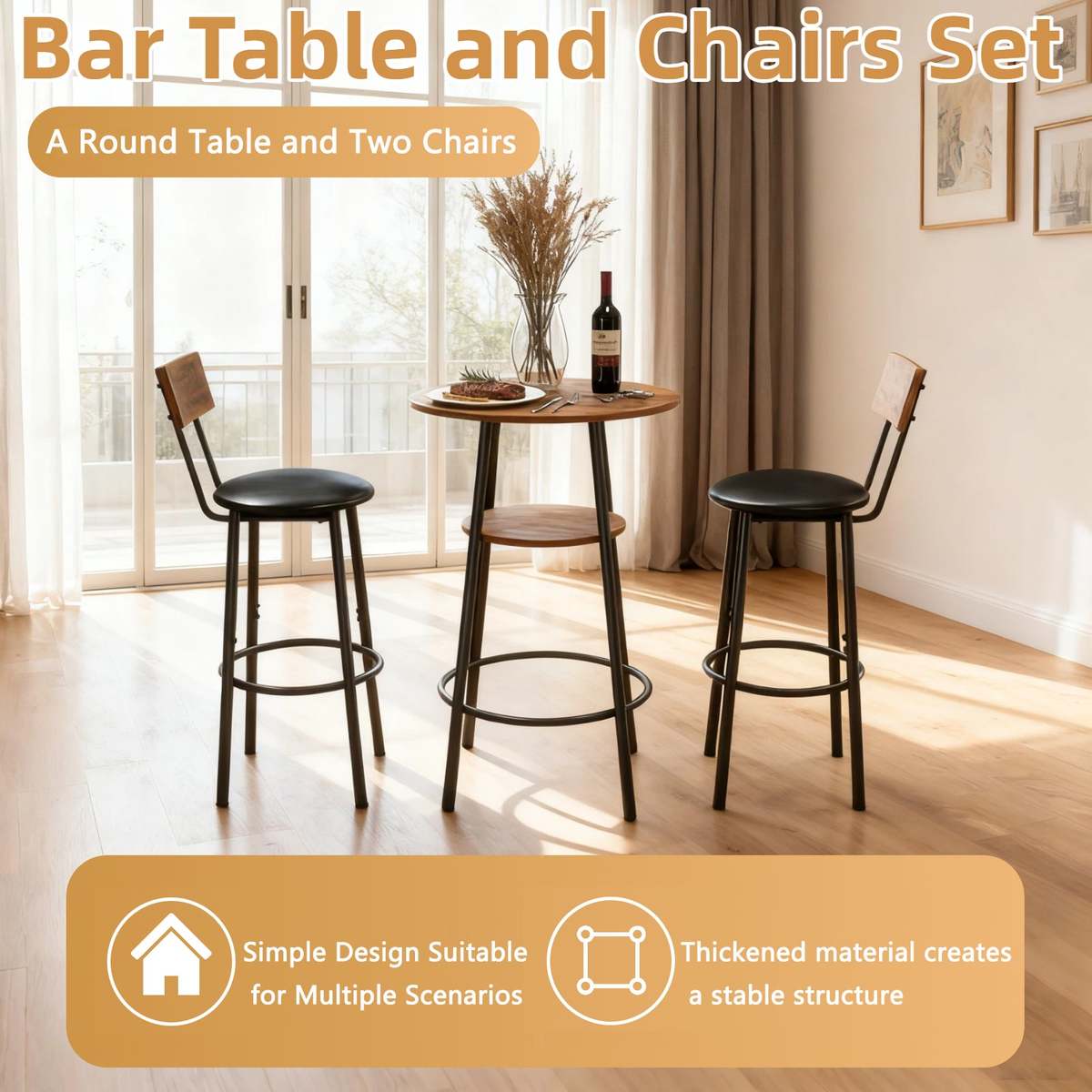 ?APPLICABLE IN MULTIPLE SCENARIOS: This bar table and chairs set includes a bar table and two ergonomic chairs, easily fitting into various spaces, including the kitchen and living room. Whether enjoying breakfast alone in the morning or chatting with friends over drinks in the afternoon, it perfectly meets daily leisure and light social needs, allowing even small spaces to be versatile.