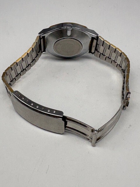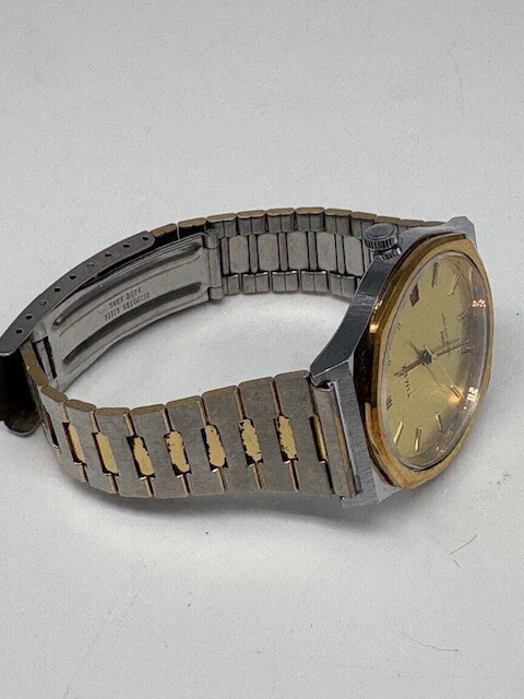 This vintage1982 Timex Marlin manual wind men's watch features a two-tone design with a gold face and silver accents.