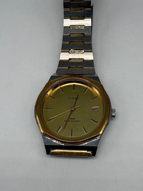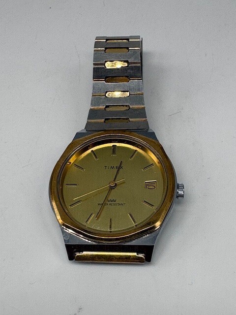 1982 TIMEX MARLIN Manual Wind Men's Watch Two Tone w/ Date Display - Gold Face