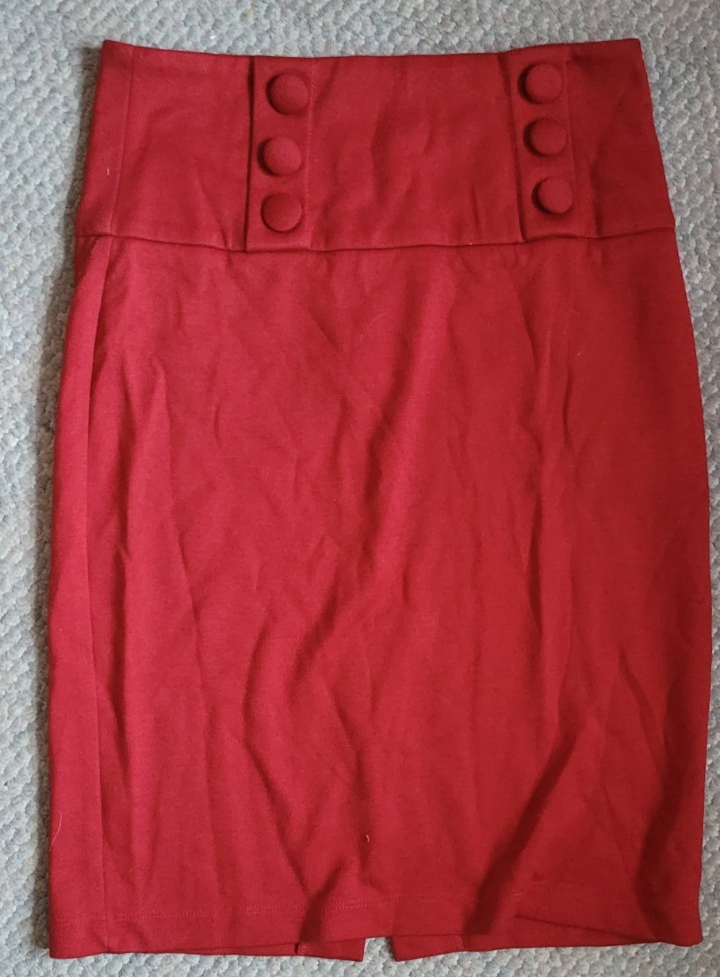 This skirt is in good used condition. There are no holes or stains that I found. The size is Small. Measurements are approximately: Length: 24 inches. Waist: 14 inches. The zipper works well. 1 or 2 of the decorative buttons could use a little extra stitch to make them tighter.