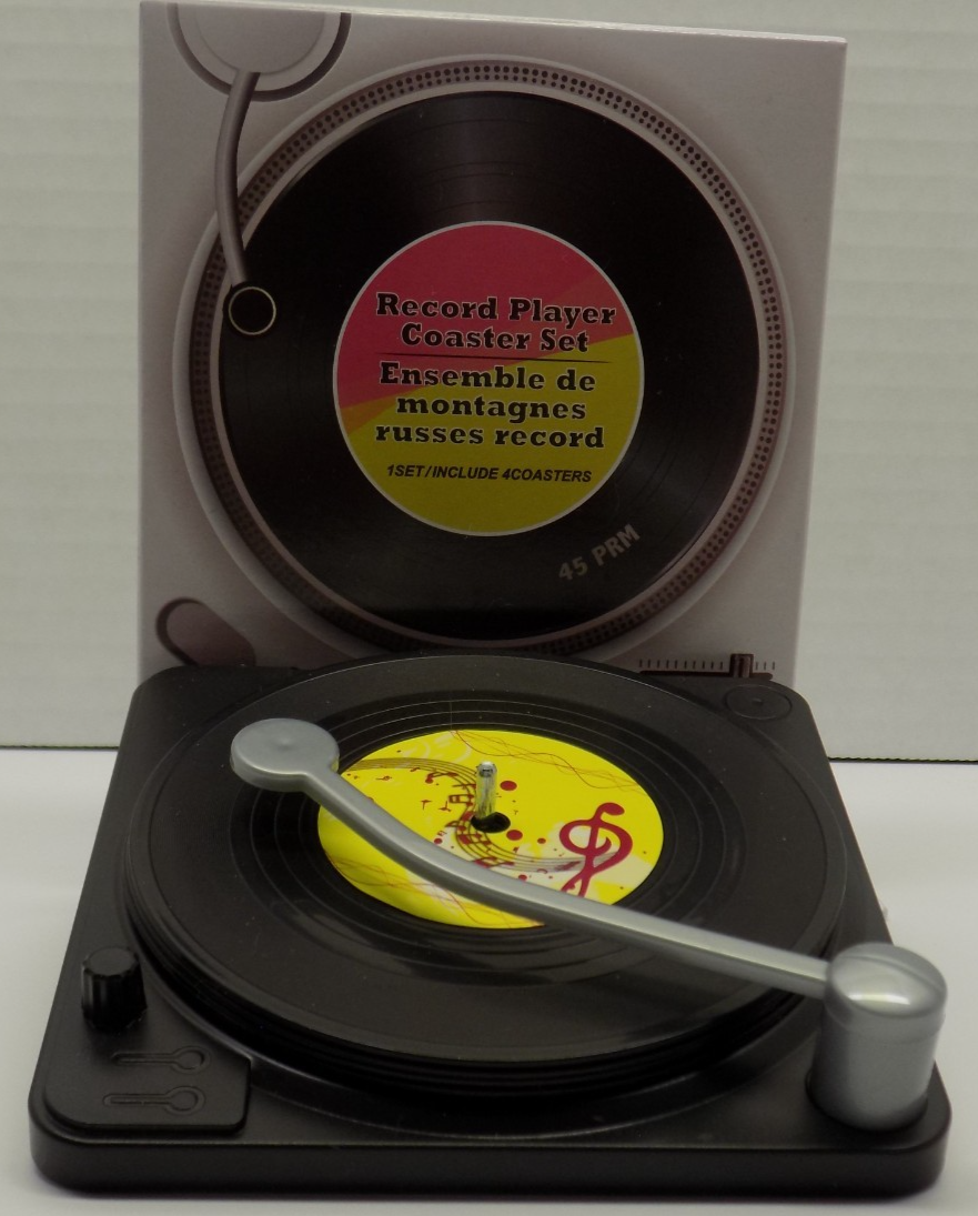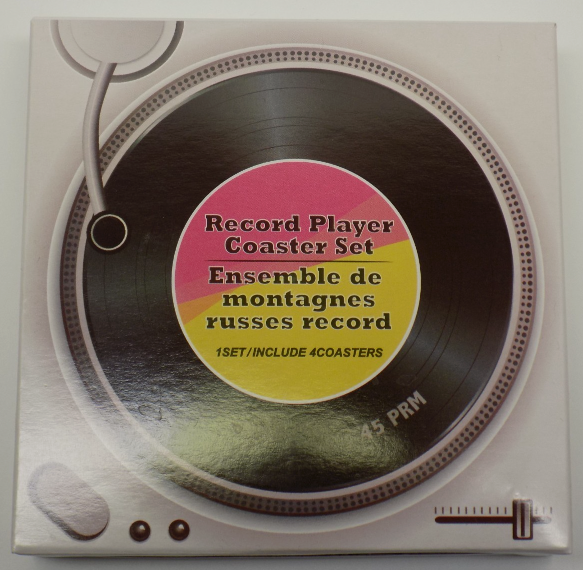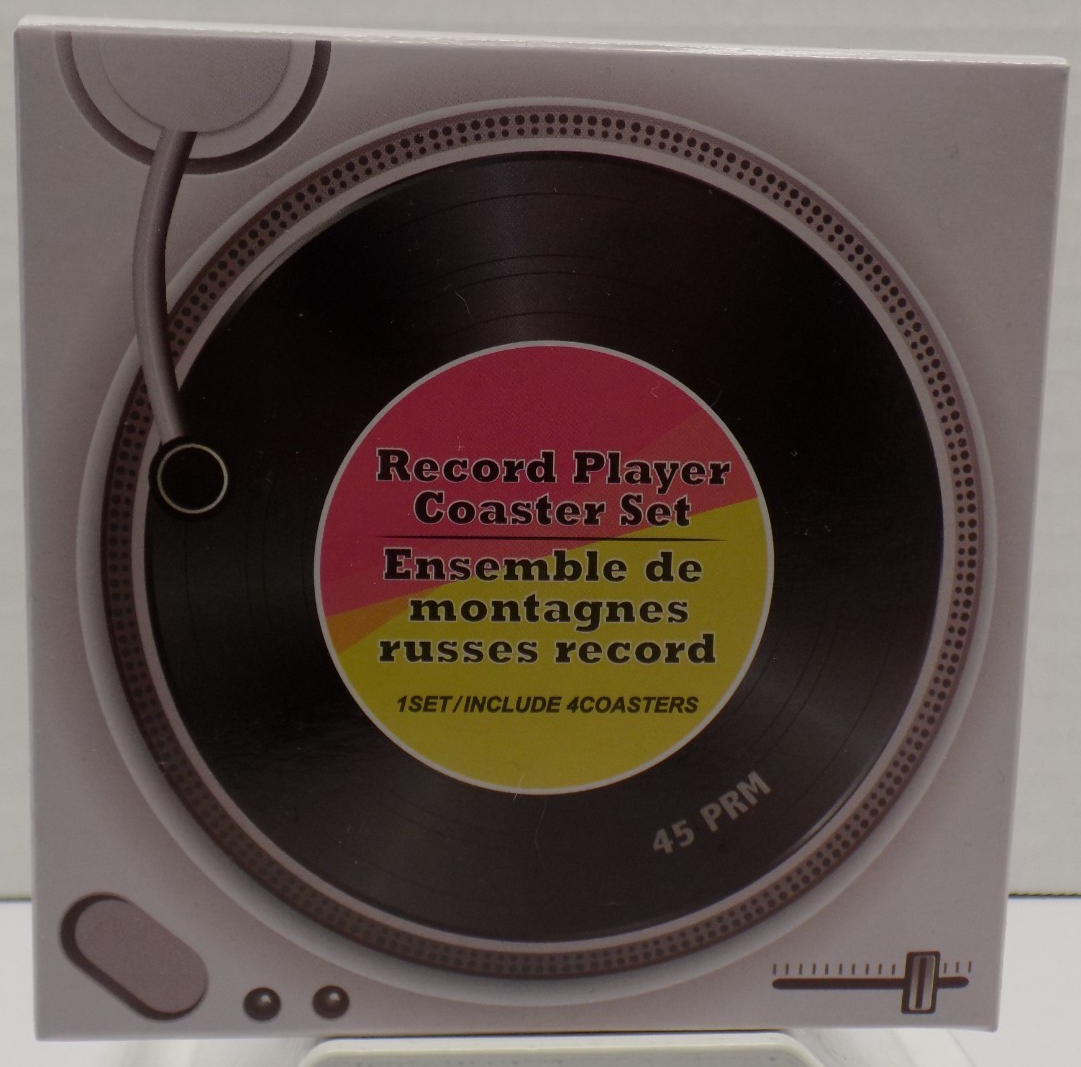 Add a fun, nostalgic touch to your home, office, or coffee bar with this music?themed coaster set. Designed to look like a miniature record player, the turntable-style base holds four colorful vinyl?inspired coasters, each with its own unique 45 RPM label design. Perfect for music lovers, collectors, or anyone who enjoys quirky, conversation?starting decor.
