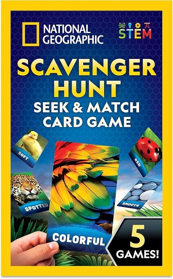 With National Geographic's Seek Match Scavenger Hunt Card Game, kids can explore their world as they search for objects that match the words on their cards! With 5 game modes and 40 jumbo, easy-to-hold cards, this game provides endless amounts of screen-free fun and learning, indoors and outside!
