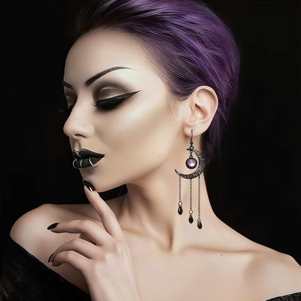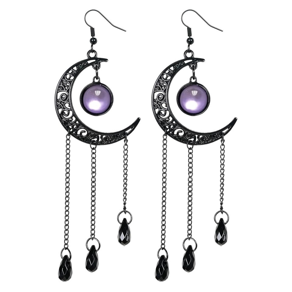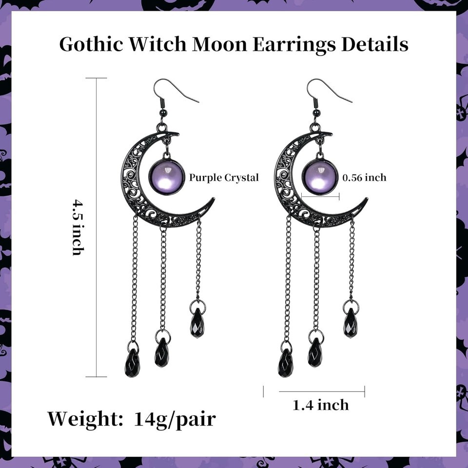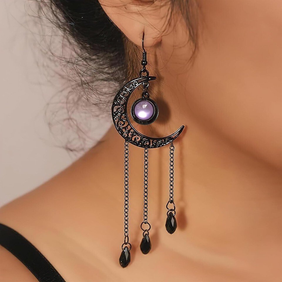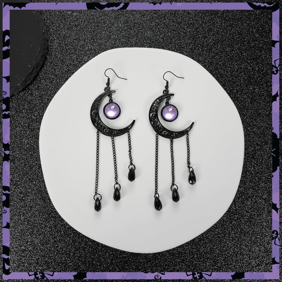 Step into the darkly enchanting style with these Moon Gothic Halloween Earrings. Featuring elegant black moons with intricate cutouts and three-layer fringe chains, these earrings capture a classic retro gothic vibe. The purple crystal centerpiece refracts light beautifully, making it the perfect focal point for any dark-themed outfit.