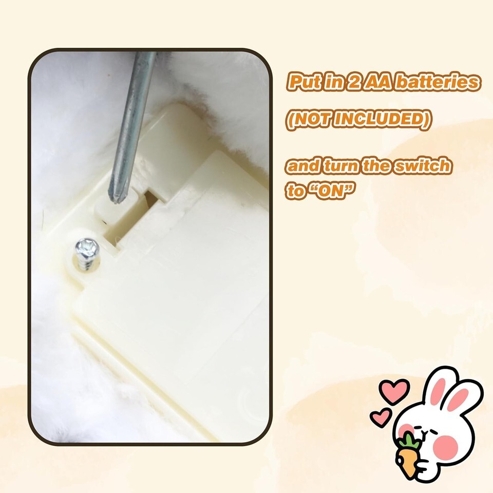 EASY TO USE: Simply insert 2 AA batteries(NOT INCLUDED) to the battery holder on its tummy.,turn the red switch to ON, and this delicate jumping rabbit will start walking with chirp and hopping forward