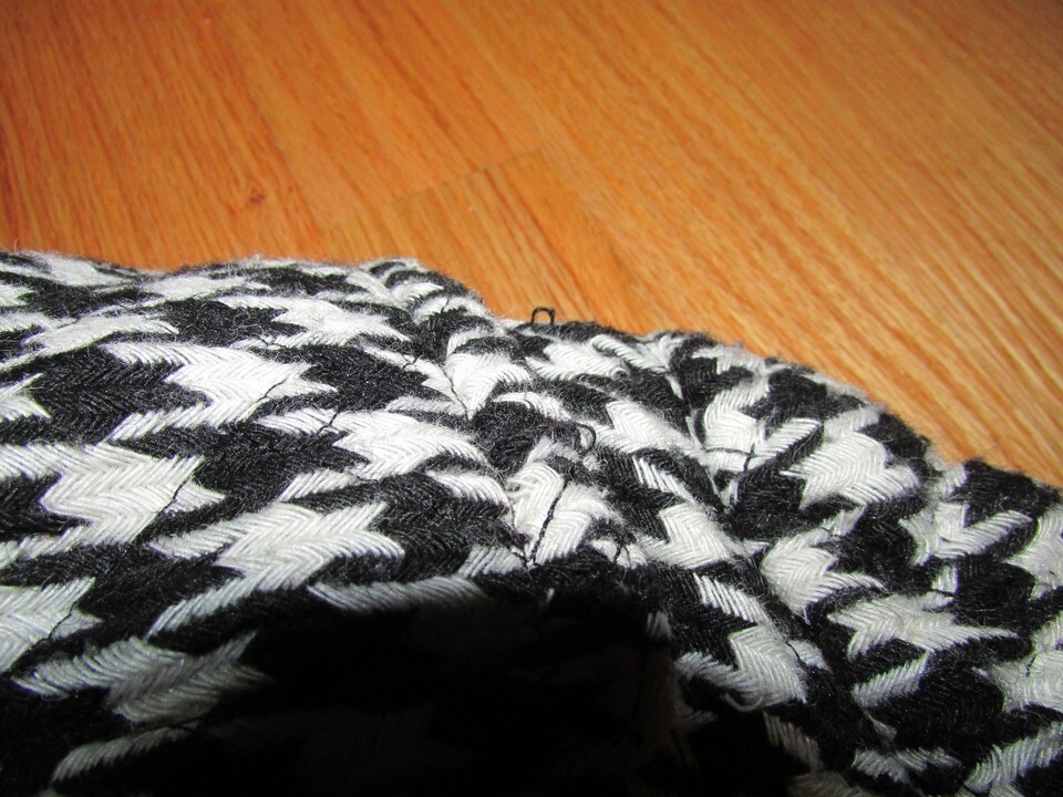 It is a waist-length Wool blend herringbone in back/white. There are a few thick "threads" that are a little loose here and there-typical of this material (see photo 2).