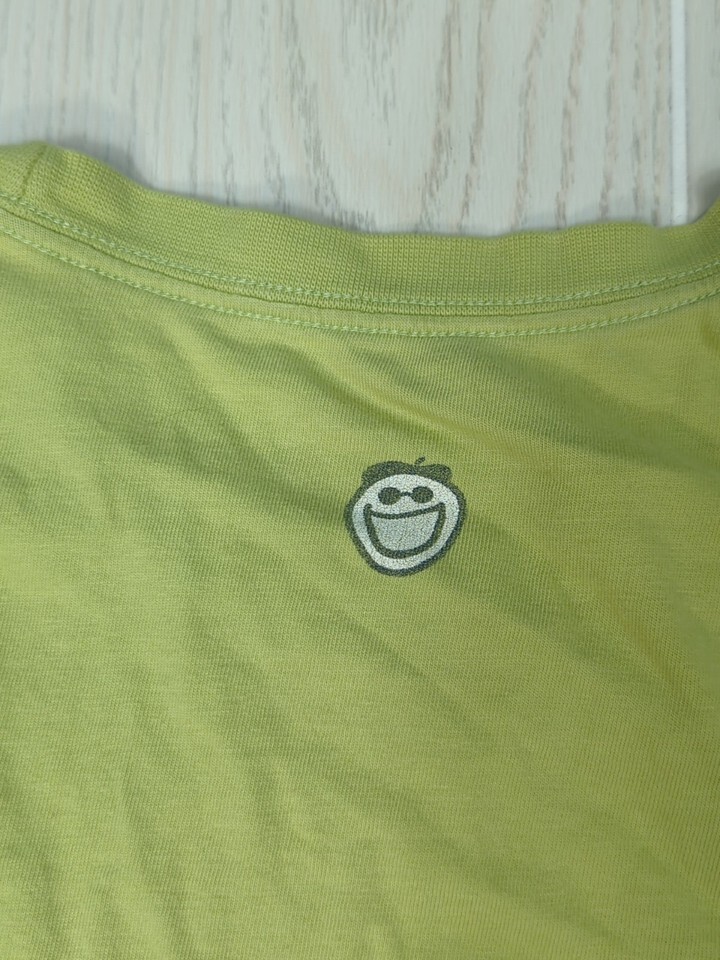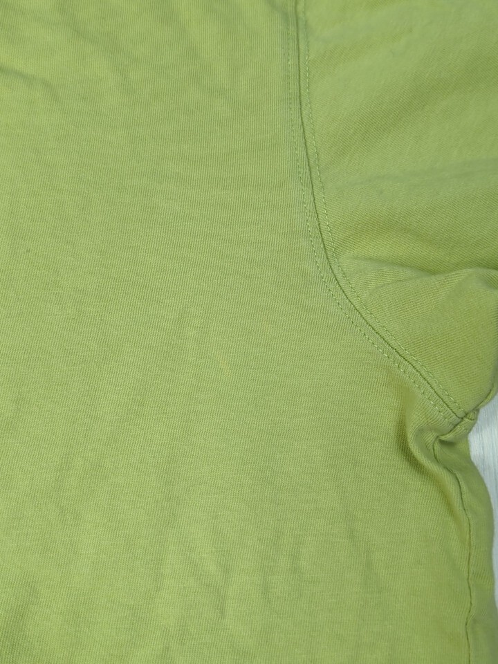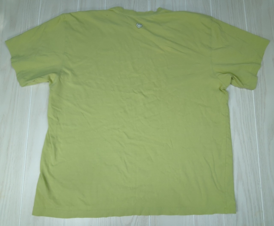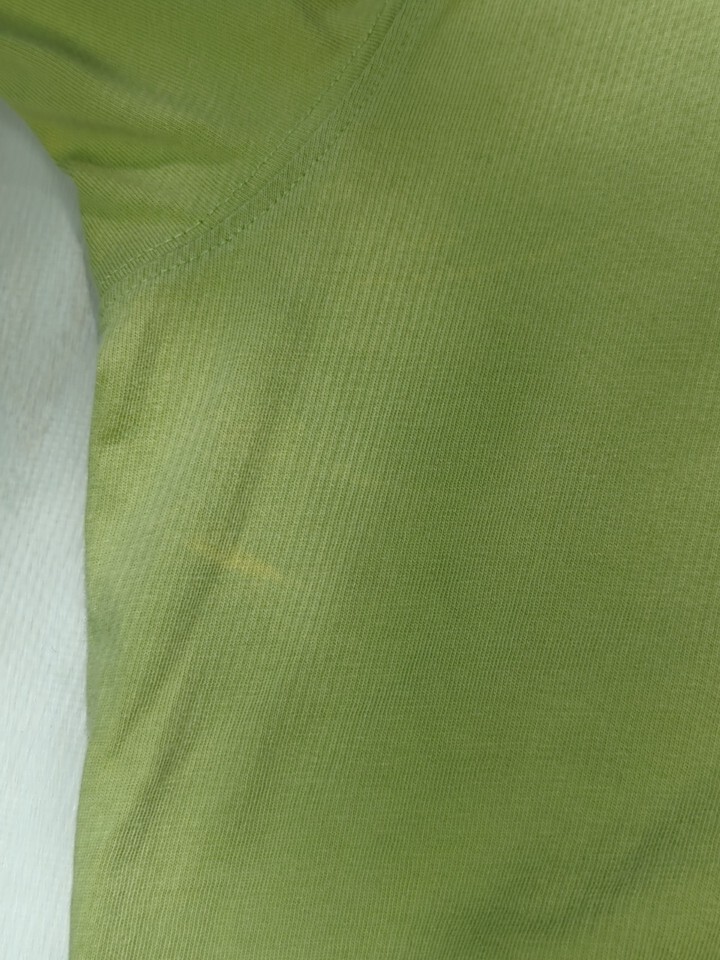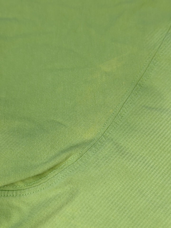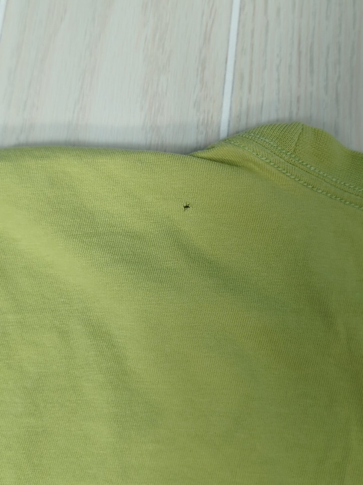 The neck is rippled, small hole on back of one shoulder, image faded, and it has some lighter bleached spots, as shown.