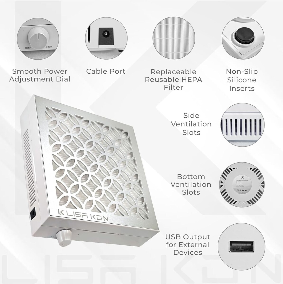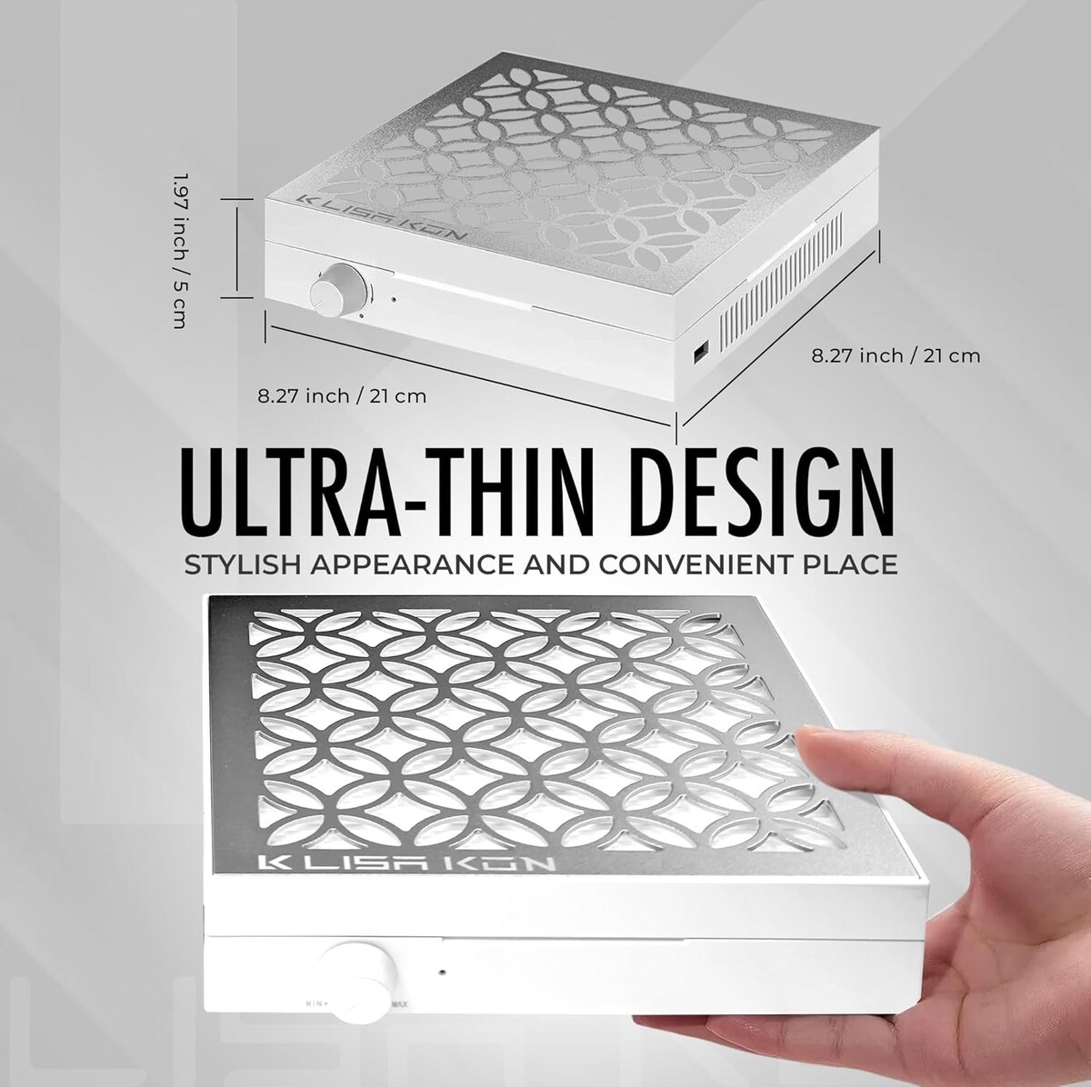 Compact and Powerful: With a thickness of just 55mm, our nail dust collector provides a 100% vacuum effect, efficiently absorbing nail dust from all directions.
