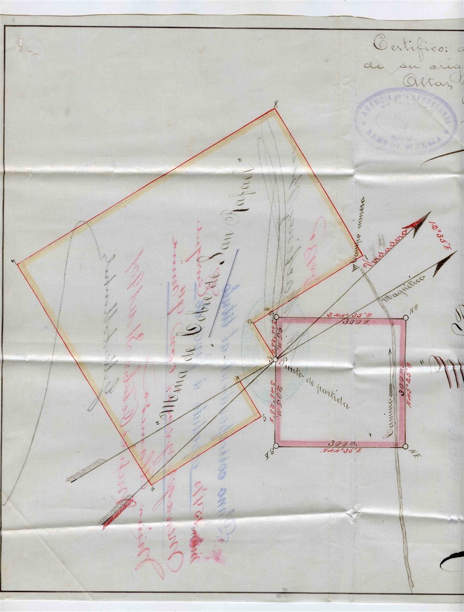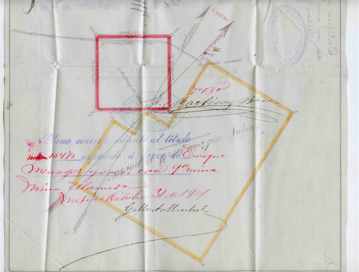 This is a hand drawn map of the location of the San Rafael Mine in Mexico . It measures about 10 1/2" x 12 1/2" and is printed on an acetate type paper. It is dated 1899 and is stamped and signed on the back, dated October 31, 1901.
