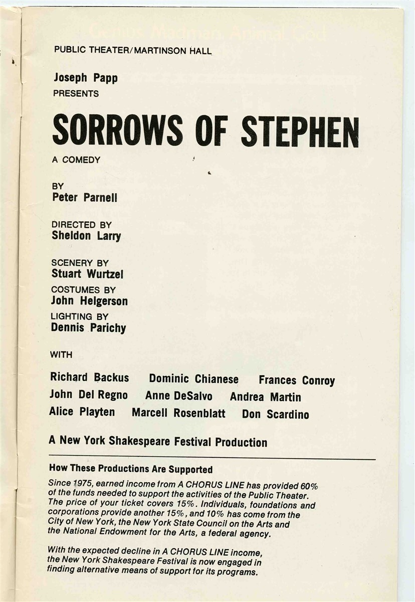 Sorrows of Stephen Program Public Theatre Martinson Hall New York 1979