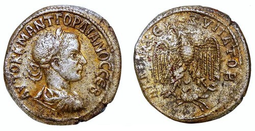 Obverse: AYTOK K M ANT ?OP?IANOC C?B, Unabridged: AYTOK(-?????) K(-?????) M(-?????) ANT(-??????) ????????C CEB(-?????). Translation: "Emperor Caesar Marcus Antonius Gordian, August", Laureate, draped, and cuirassed bust right of Gordian III seen from behind.