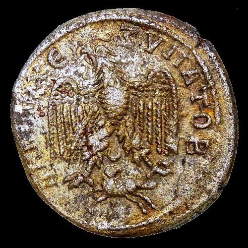 This second emission issue shows the absence of the SC on the reverse and its replacement by a ram (Aries) in a very particular position (looking backwards) under a crescent moon pointing up. It is a near certainty that this ram designates the city of Antioch. The usual interpretation is not very convincing (the Moon in Aries would be the astronomical position at the time of the foundation of the city) but not entirely without merit.