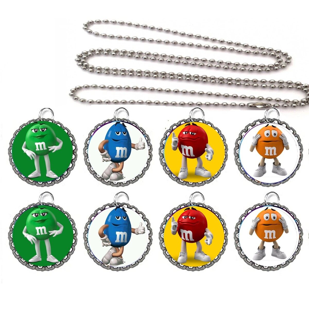 This product is a lot of 10 necklaces featuring a MandM candy design, perfect for use as party favors or birthday gifts. Each necklace carries a fun and colorful M and M candy theme, making them a playful addition to any party or celebration. these necklaces are sure to delight recipients and add a touch of candy-inspired charm to any event.