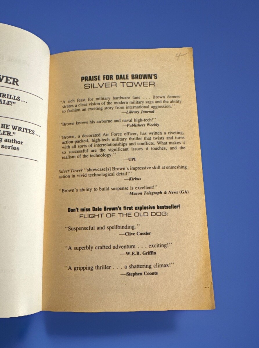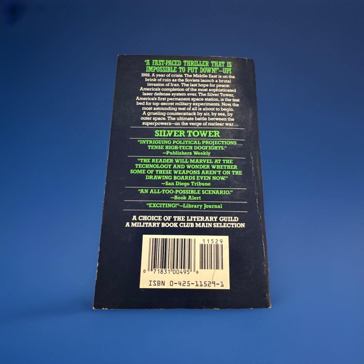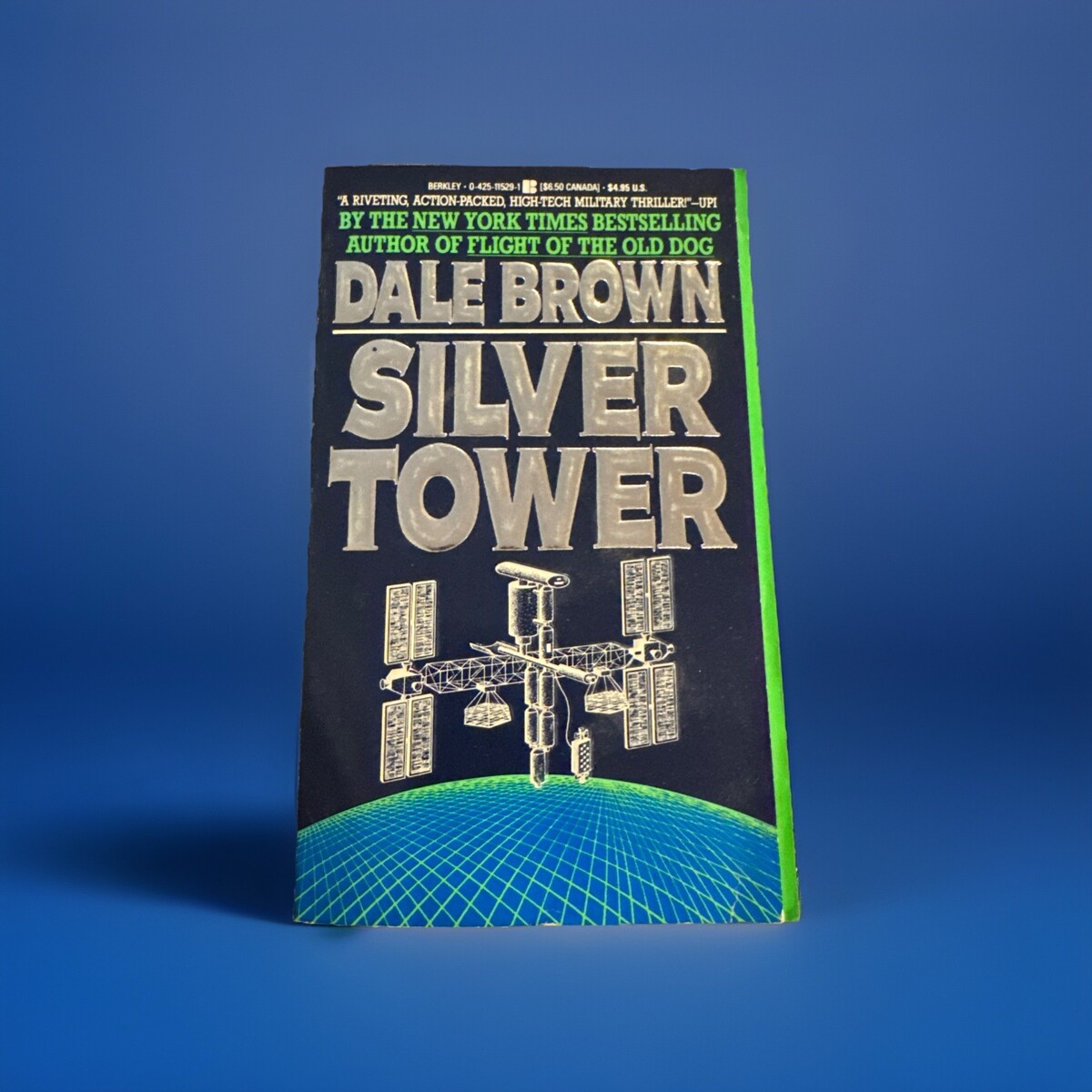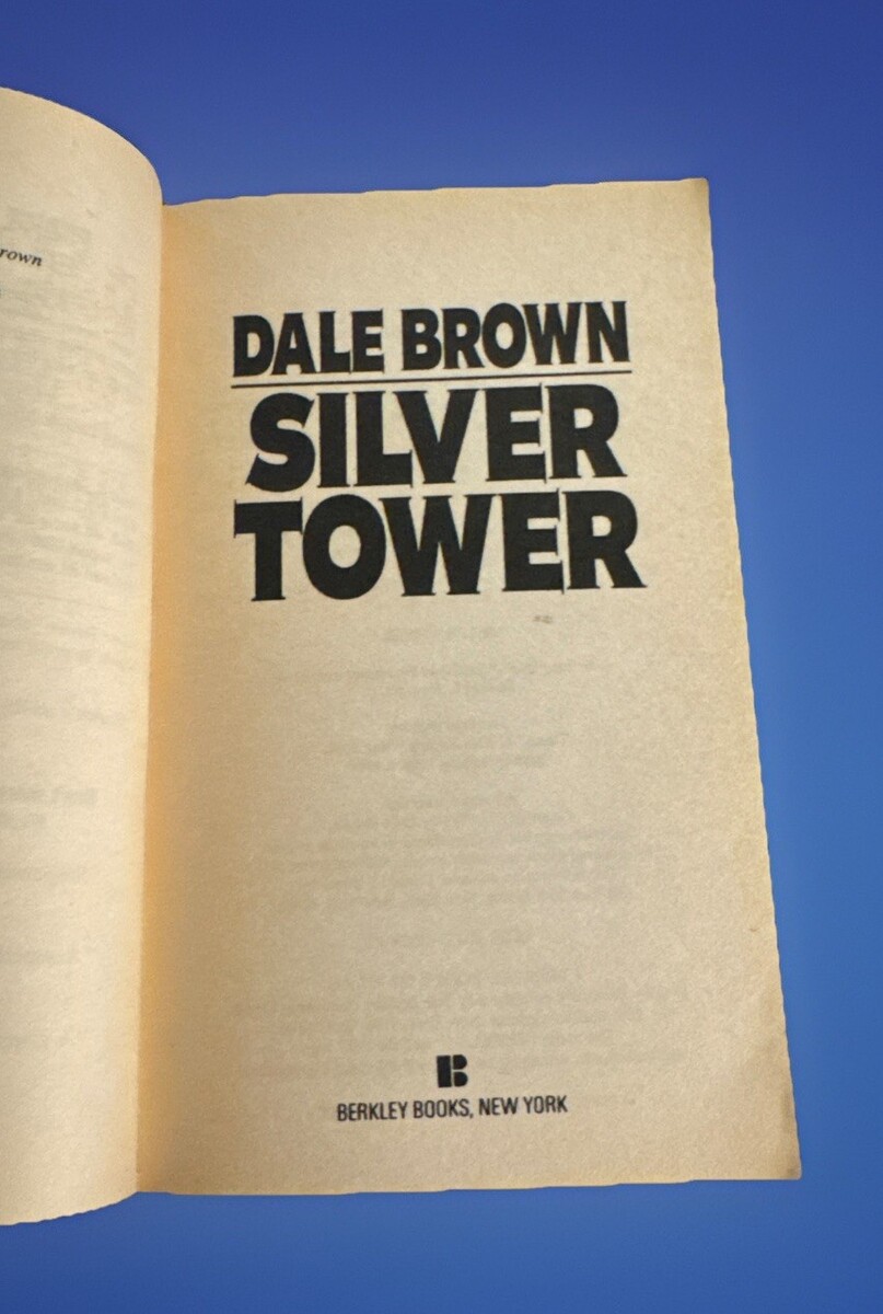 The product is a vintage paperback book titled "Silver Tower" by Dale Brown, published in 1989 by Berkley. This drama novel is written in English and originates from the United States. The book is not signed, personalized, or inscribed, making it a straightforward addition to any book collection for fans of the genre.