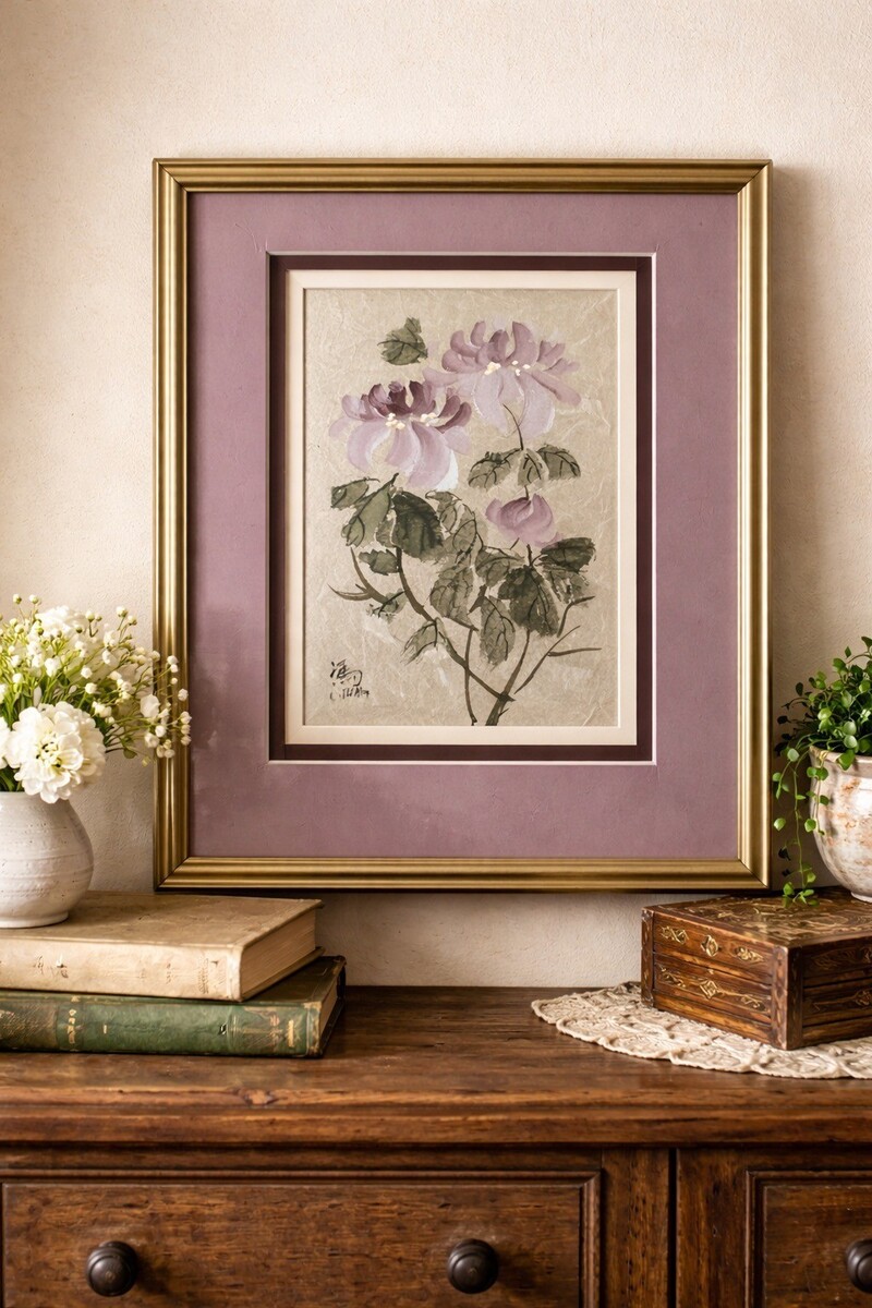 Delicate Chinese brush painting featuring soft lavender blossoms and leafy branches, signed by the artist Charlotte Fung Miller. The artwork is presented in a mauve mat with layered inner matting that complements the floral tones. Traditional brushwork and muted colors give this piece a calm, timeless feel. Sealed in plastic and ready for display or gifting.