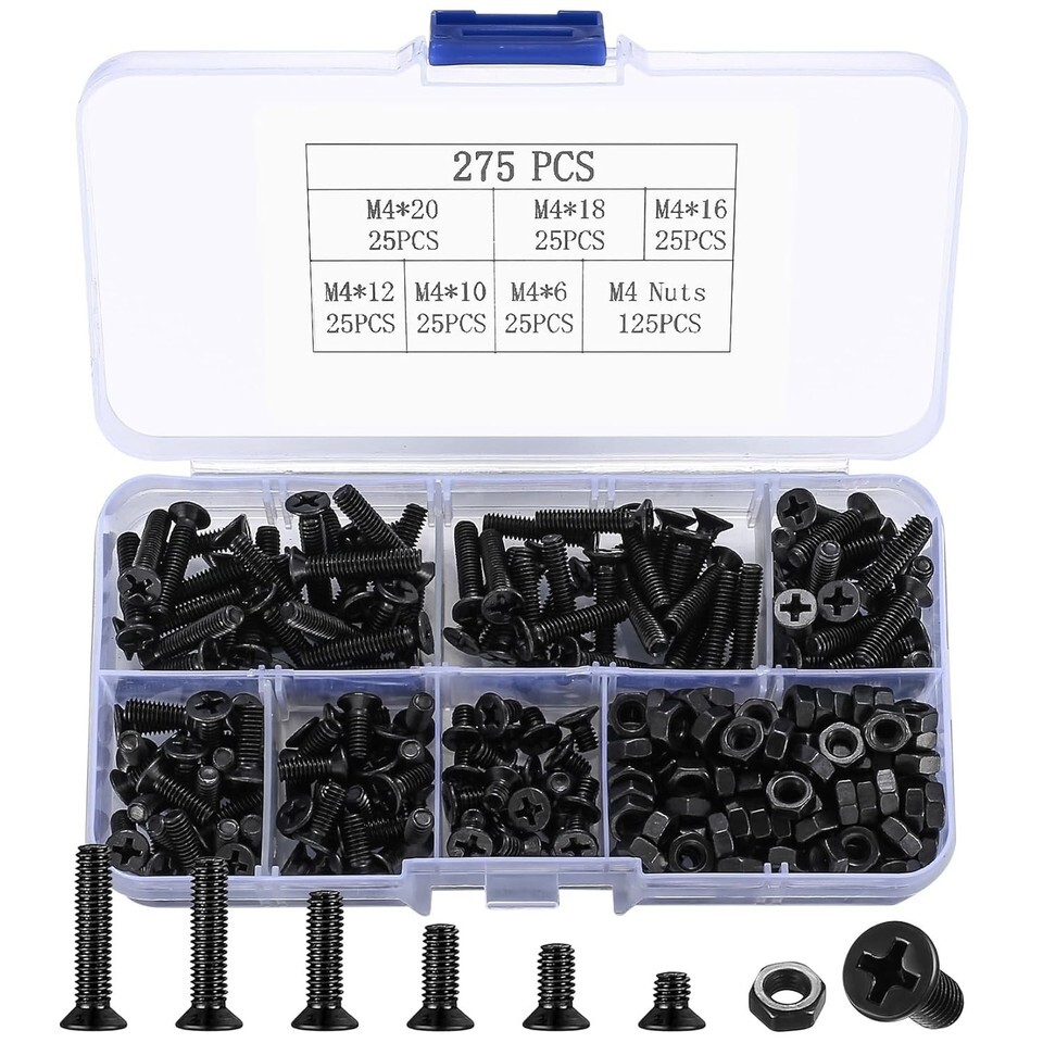 Package Includes: You will receive 275 pcs in total, 25 pcs for each size: m4x6mm, m4x10mm, m4x12mm, m4x16mm, m4x18mm, m4x20mm, and 125 pcs m4 nuts, the quantity is sufficient and the size is rich to meet the needs of daily use.