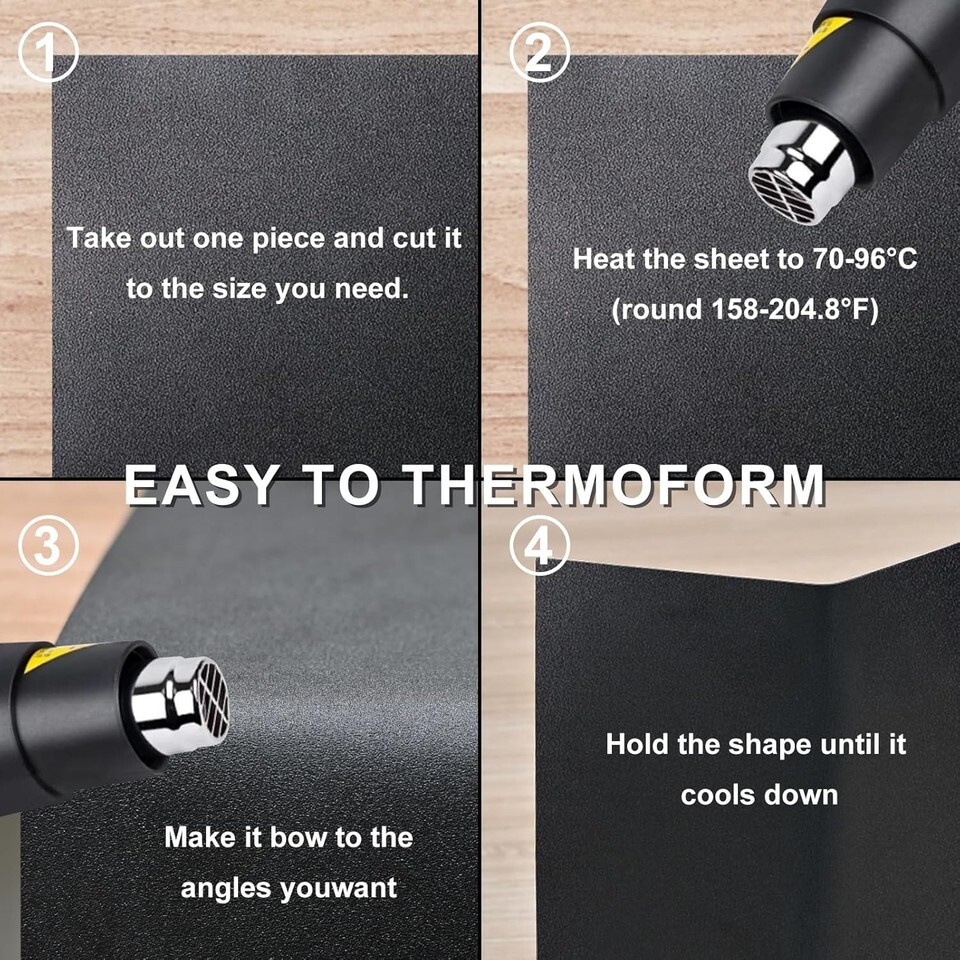 DURABLE MATERIAL: Our 8 "x12" moldable plastic ABS sheet has good elasticity and thermoforming properties. Simply heat it 70-96C (158-204.8F) and bend it to the angle you want and hold that shape until the plastic sheet cools. And it has good impact resistance, bending within a reasonable angle under force. It is more flexible than Plexiglas sheet and more moldable than acrylic sheet.