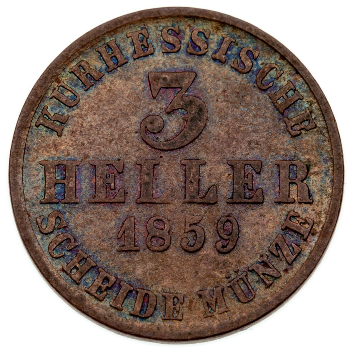 1859 German States Hesse-Cassel 3 Heller in AU Condition KM #612